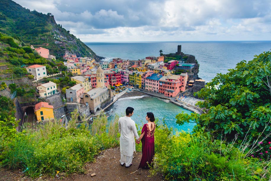 5. Up, Up and Away! – This aerial shot was taken at Vernazza, one of the five villages in The Cinqe Terre. There is a visual contrast – a very European backdrop to a very ethic couple. (The saree is designed by Kashveen Kohli.) There are no hotels here so we woke up at 5 am for the 6 am train and hiked uphill for an hour to get to this location. The couple are standing inches away from a few hundred foot drop to the ocean!
