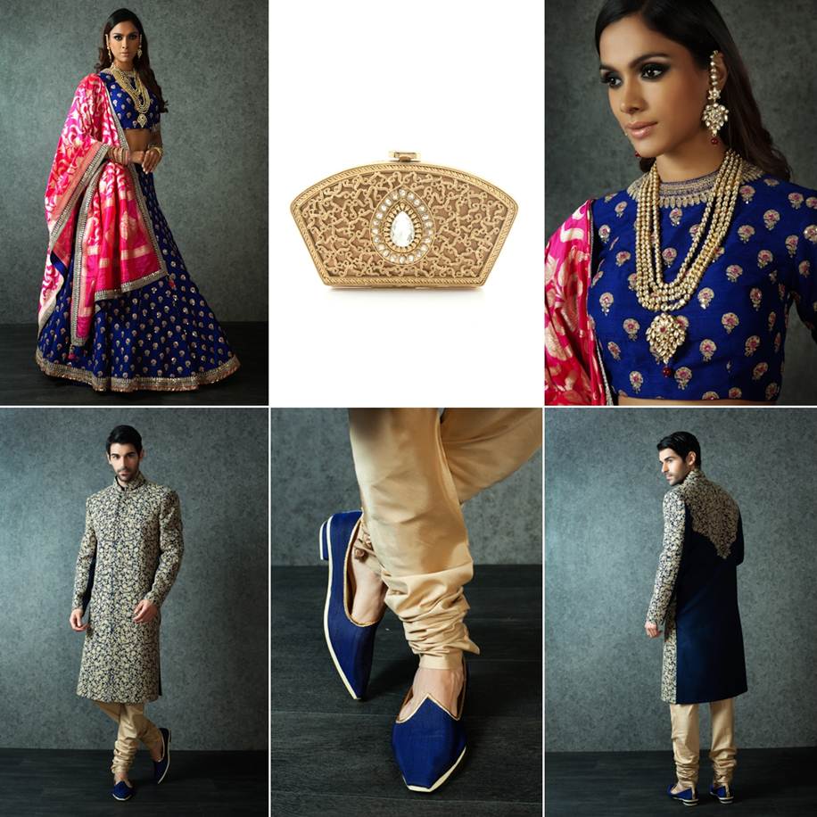 The bride wears a pure raw silk lehenga in royal blue offset by a fuchsia Benarasi woven-silk dupatta, embellished with dori, zari and sequins. She accessorizes with a traditional gold plated vilandi set with ruby stones and ruby drops. An antique gold clutch is the perfect touch to complete the look of a maharani.