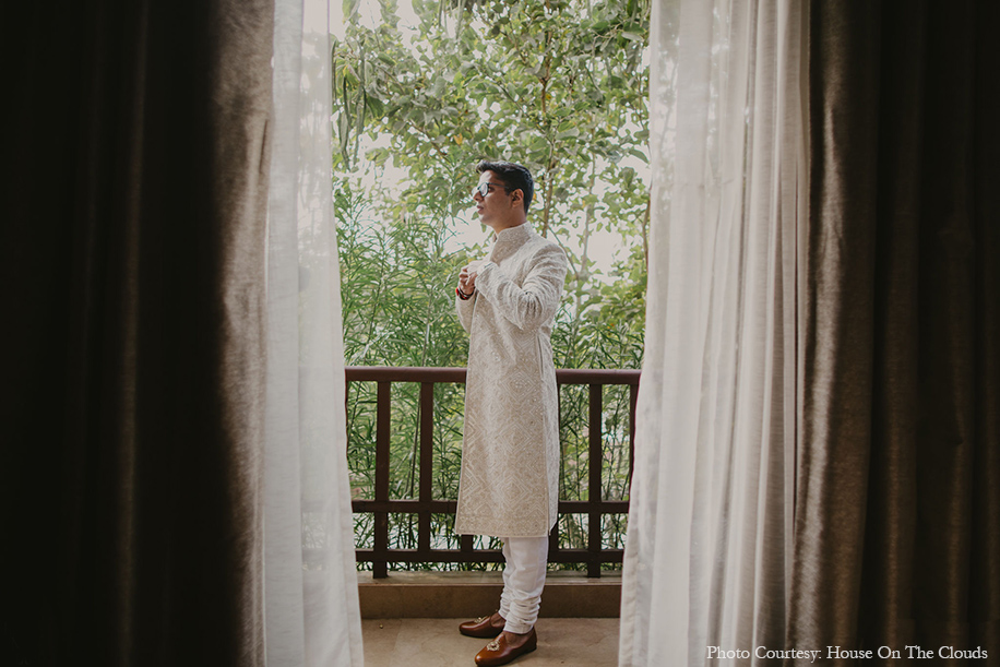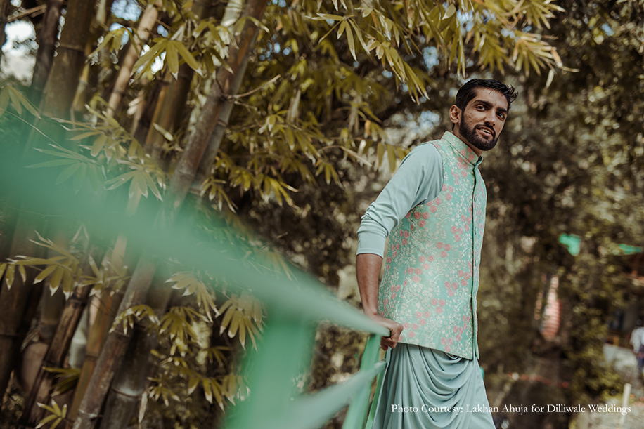 Vardaan donned a mint indo-western cowl kurta and jacket set from Gargee Designers by Ravi for his outdoor engagement ceremony near Naukuchiatal Lake.