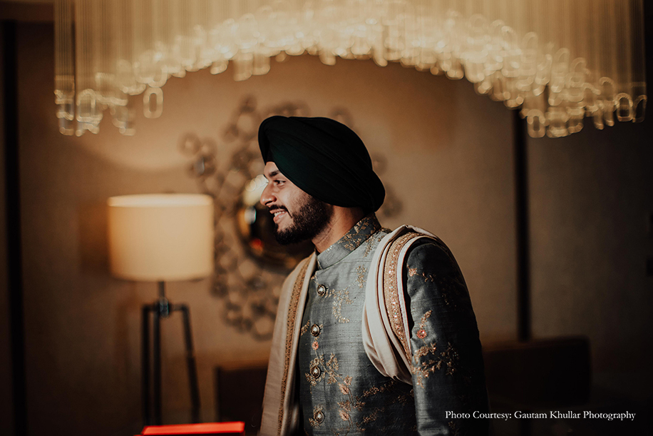 Sanjay wore an ivory and mint sherwani with gold embroidery on the borders of the stole by His Studio, Chennai for his Anand Karaj ceremony.