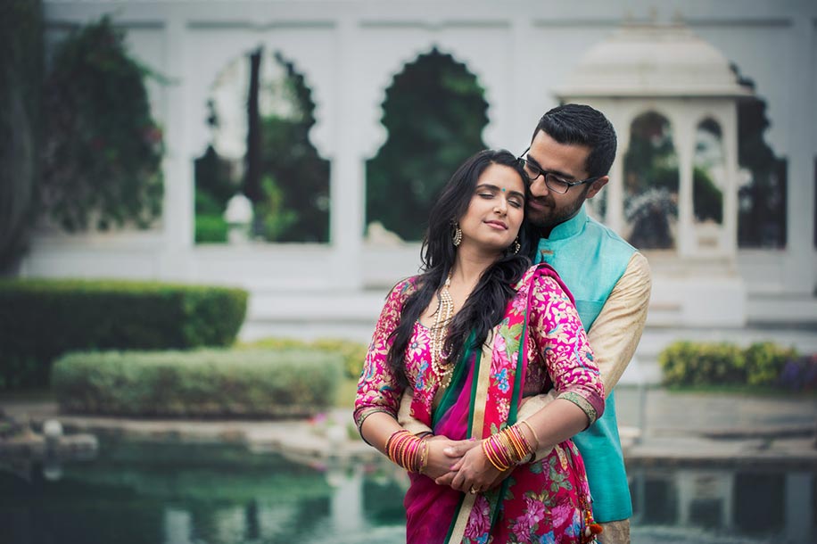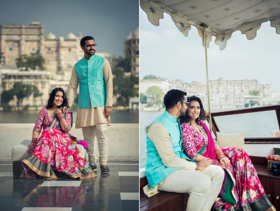 Shweta and Sagar may live in the US, but they found the perfect spot for their pre-wedding shoot in Udaipur. Pronounced one of the most romantic hotels in the world, Taj Lake Palace captured Shweta’s imagination, “Once I seen pictures of the Taj Lake Palace I knew it was the perfect location for our engagement photo shoot. The next big thing to fix was zeroing in on an awesome photography team – and we chose DotDusk Studios because we loved their work which we saw online.”