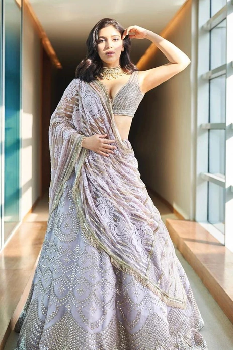 Bollywood Actress Bhumi Pednekar dolled up in a mauve lehenga by Manish Malhotra and it is such a stunner! Complete with intricate badla and threadwork and delicate pearl embellishments, this pastel lehenga is perfect for intimate weddings for the bride as well as bridesmaids. Throw on a tiny choker and let the lehenga do the talking as you twirl around in this beauty.