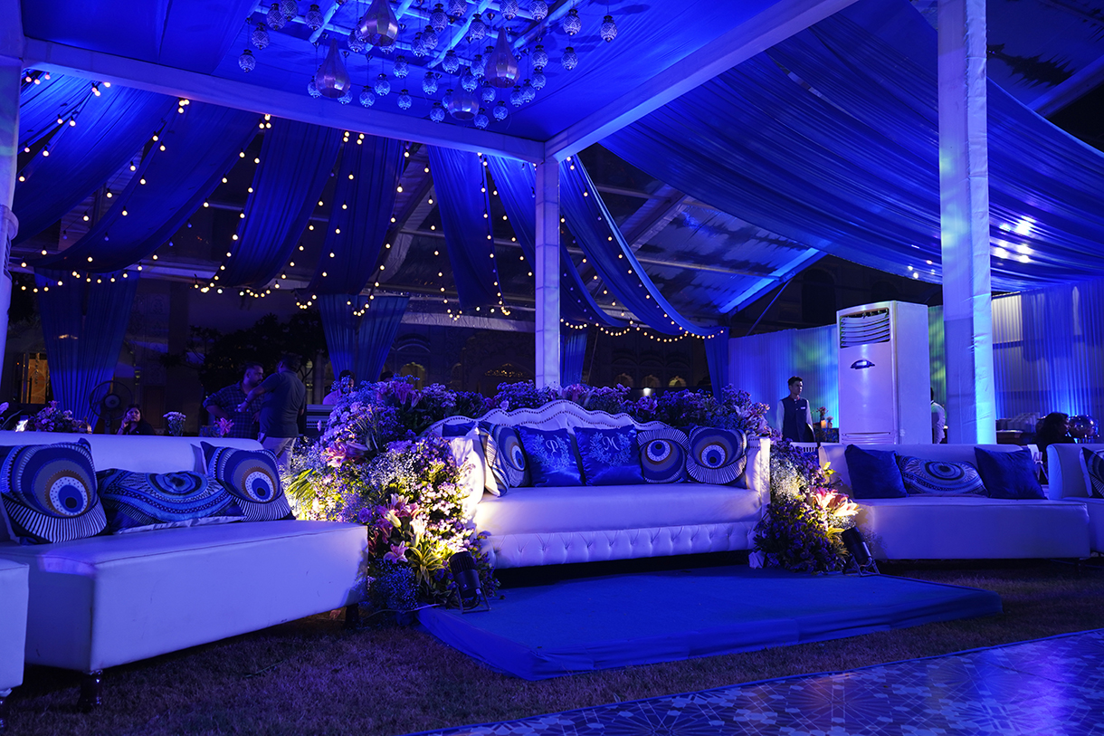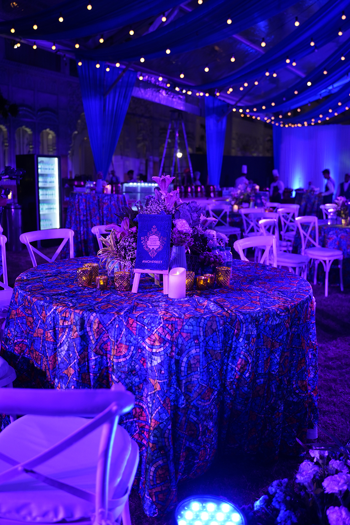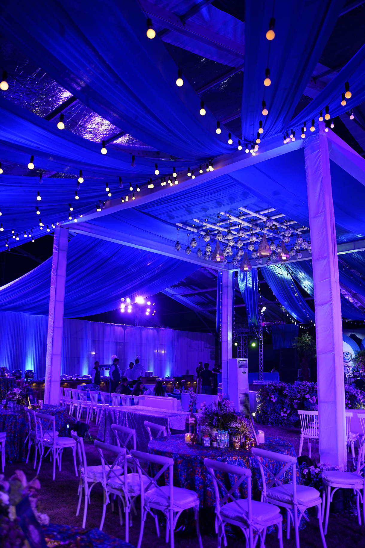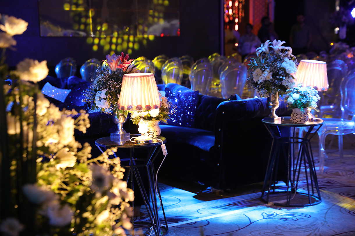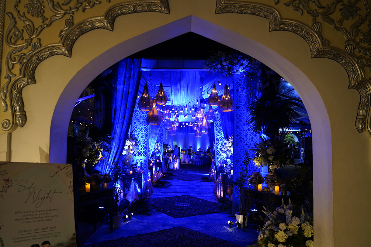 With a theme that revolved around the immensely popular Turkish evil eye motif, the Sufi Night was a magical one. The team shares, “The central theme of the Sufi celebration revolved around the evil eye motif, symbolizing protection and warding off negativity. A dedicated area was set up for a solemn prayer or blessing ceremony conducted by a spiritual leader. Soft, ambient lighting in warm golden tones created an ethereal glow throughout the space. Renowned Sufi artists performed soulful music and dance, captivating the audience with enchanting melodies. Deep royal blues, turquoise, and sapphire hues were used in the tablecloths, drapes, and decorative elements, evoking a sense of mysticism. Hanging lanterns in various shapes and sizes were suspended from the ceiling. These lanterns emitted a soft, warm glow, casting intricate patterns of light and shadow across the venue. Some lanterns featured the evil eye motif, adding to the theme’s charm.”