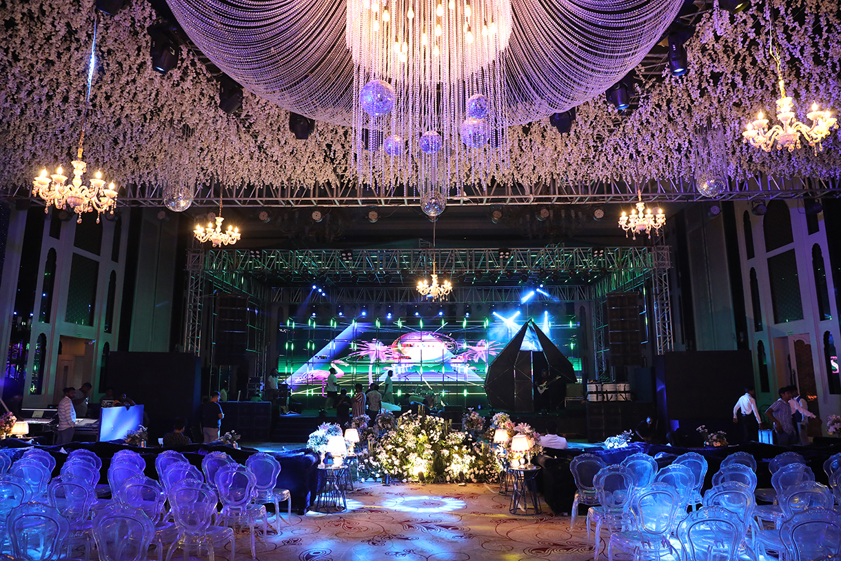 Plush cushions, personalized with the couple’s names, wedding dates, and meaningful quotes, were thoughtfully placed on seating areas. Inspired by the bride’s passion, crystals were incorporated into the decor. Crystal centerpieces adorned the dining tables, and crystal accents were featured in the tableware. The venue was brimming with blush pink florals, from the enchanting archway at the entrance to the lavish centerpieces on dining tables. Roses, peonies, and orchids in shades of pink created a romantic and elegant atmosphere.”