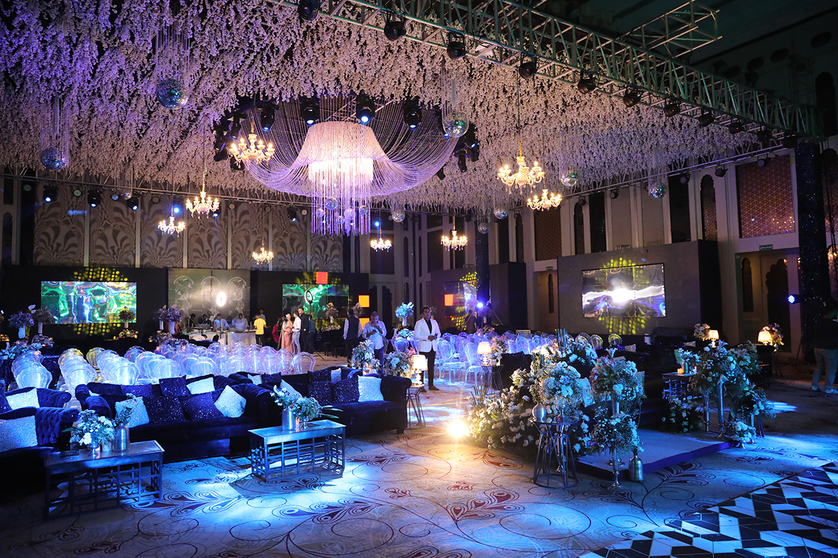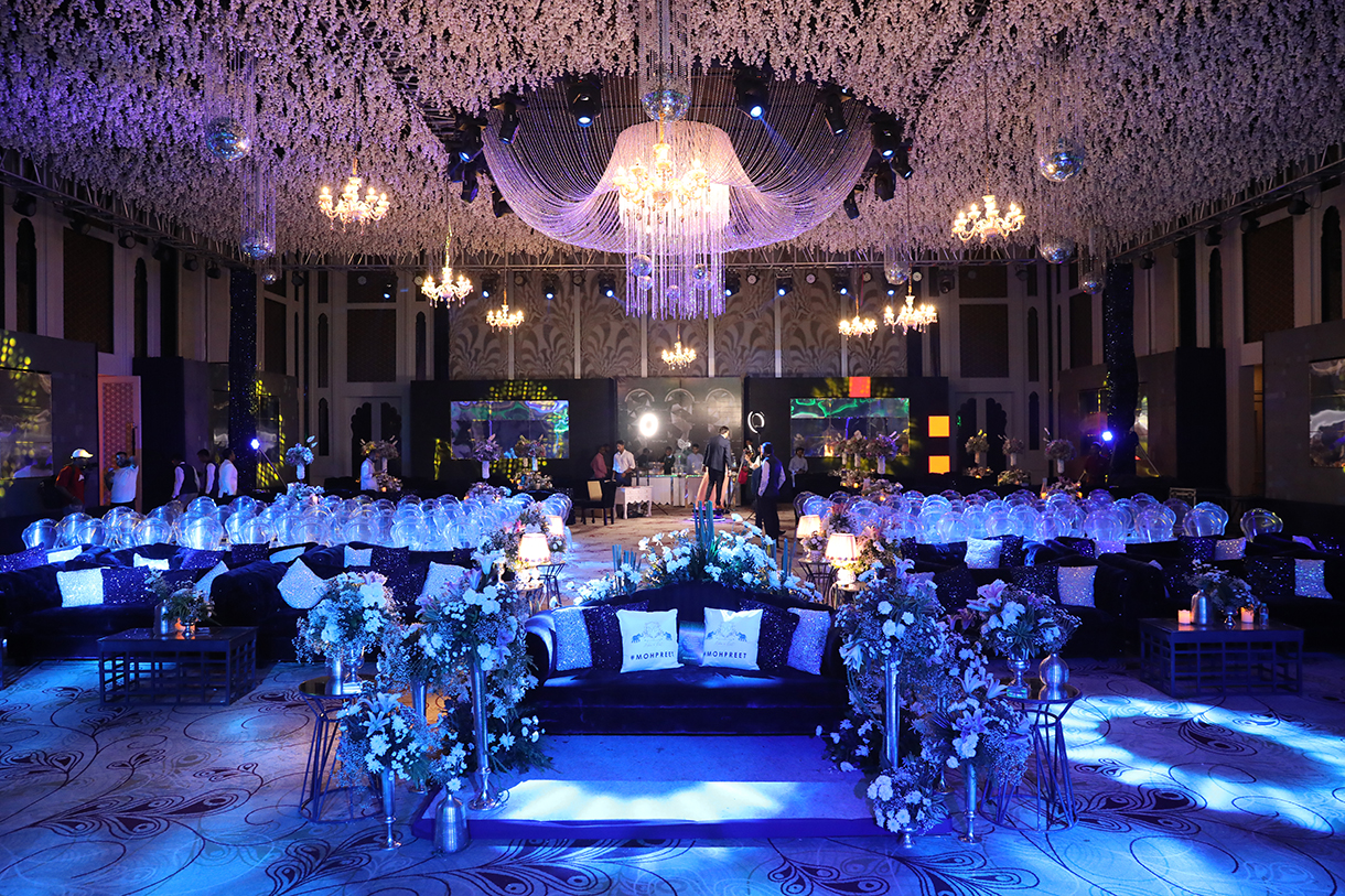 Describing the grandeur of the sangeet celebration, the planning team shares, “It was nothing short of spectacular! The grandeur of the event was immediately evident with a massive central chandelier that captivated everyone and created a fairyland-like atmosphere as per the bride’s dream. Throughout the venue, an abundance of chandeliers and blooming floral arrangements added a touch of opulence and romance. The ambience was further enhanced with soothing blue light, enveloping the entire space in a dreamy and enchanting glow. It was a night where love and luxury converged, leaving an indelible mark on everyone fortunate enough to be part of their celebration.”