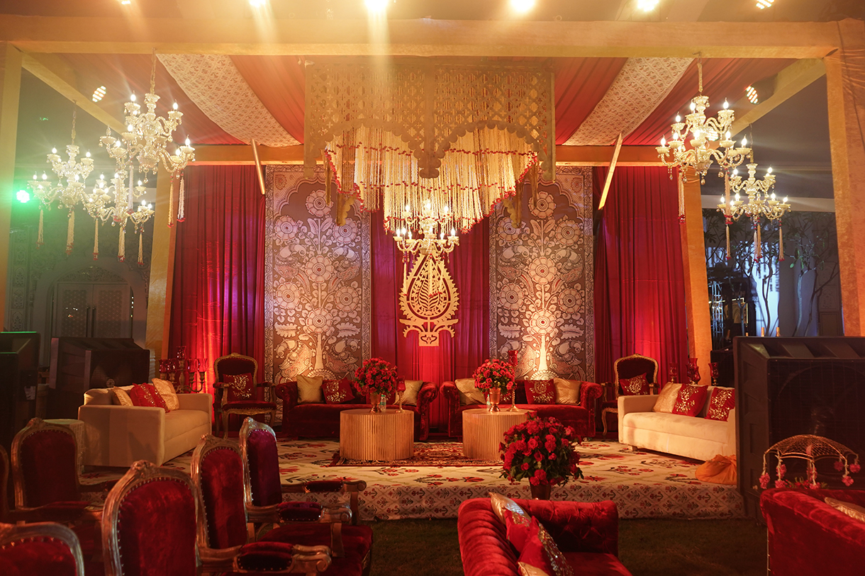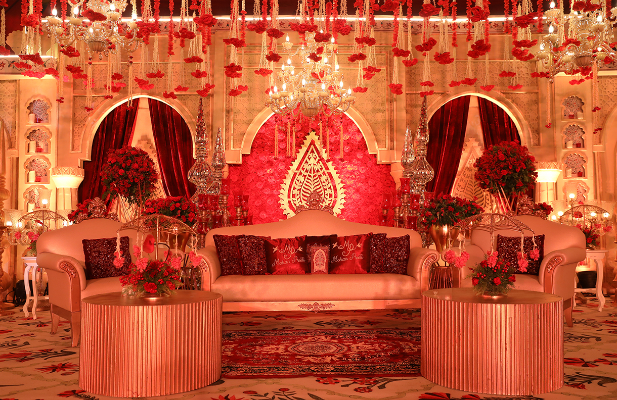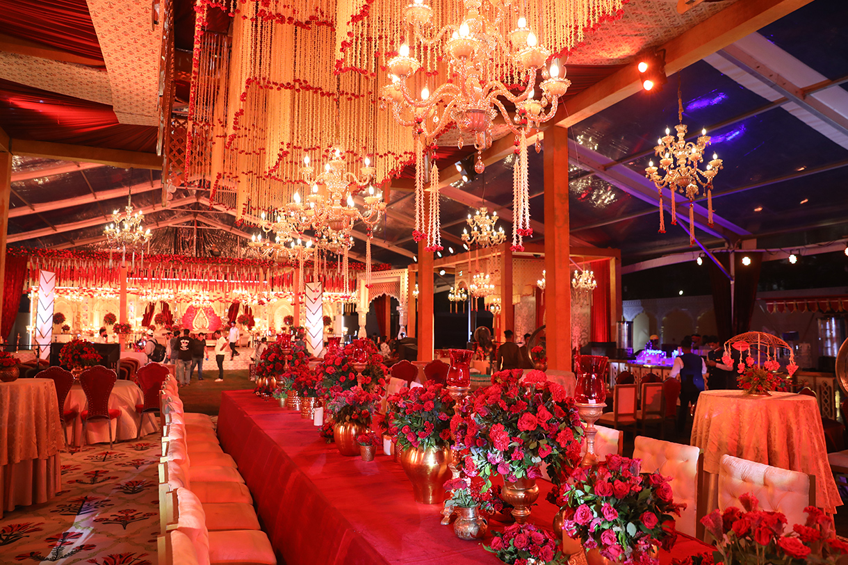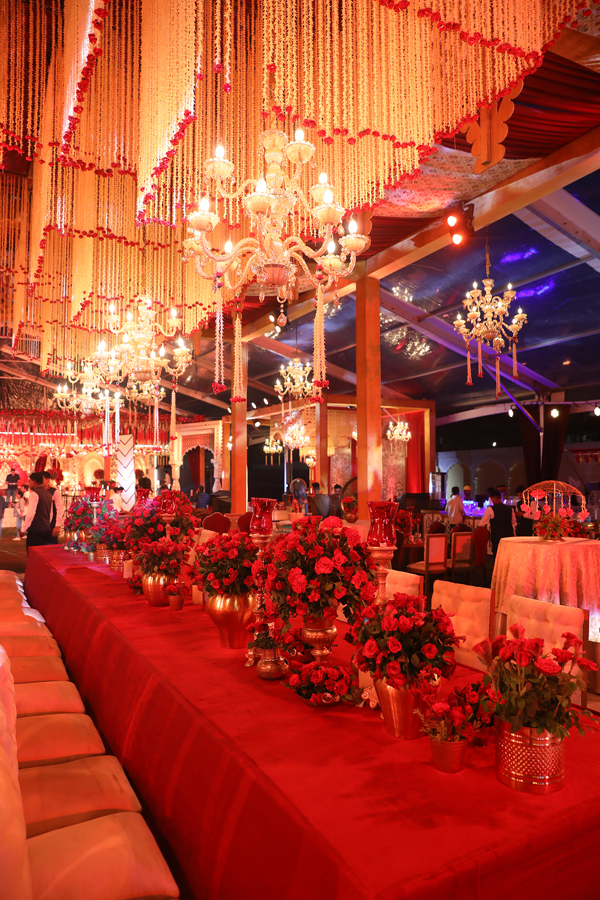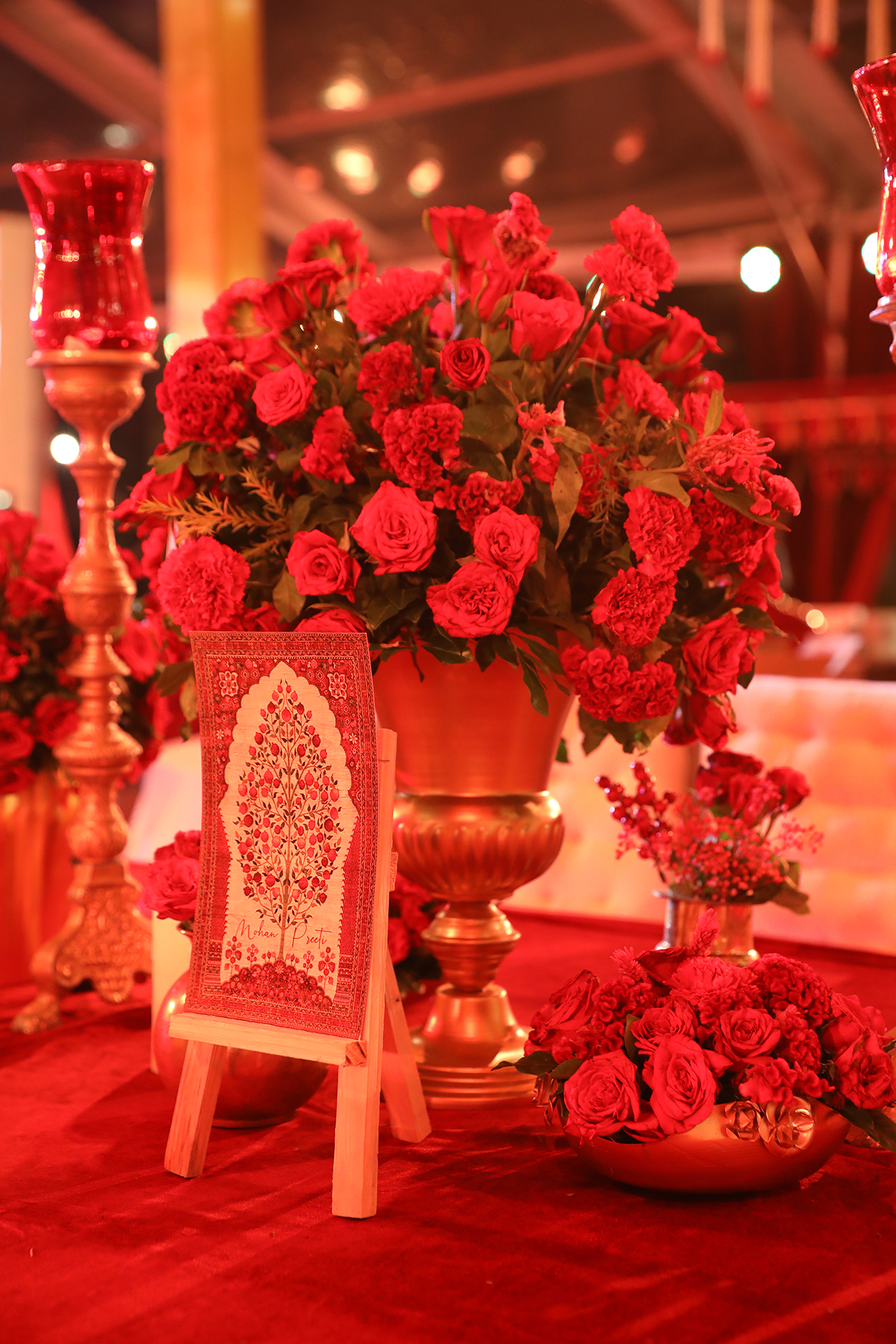 Keen on going regal, all stops were pulled on Preeti and Mohan’s big day as the planning team curated a wedding brimming with jewel tones that looked perfect against the venue’s majestic architecture. Team Bhagwati Weddings shares, “The wedding was a grand affair with a colour palette dominated by rich reds and shimmering golds. To enhance the royal ambience, exquisite chandeliers were suspended from the ceiling. These ornate lighting fixtures added a touch of glamour and provided a warm, inviting glow to the venue. The couple’s desire for a royal sit-down dinner was fulfilled with beautifully decorated tables set up for the guests. These were furnished with elaborate place settings, gold-rimmed china, and crystal glassware. The decor was a blend of traditional Rajasthani elements and contemporary elegance. Richly embroidered table runners, red and golden drapes, and intricate floral centerpieces adorned each table. Golden accents, like candelabras and charger plates, complemented the colour scheme. Live instrumental music or traditional Rajasthani musicians playing folk tunes added an authentic touch to the event.”