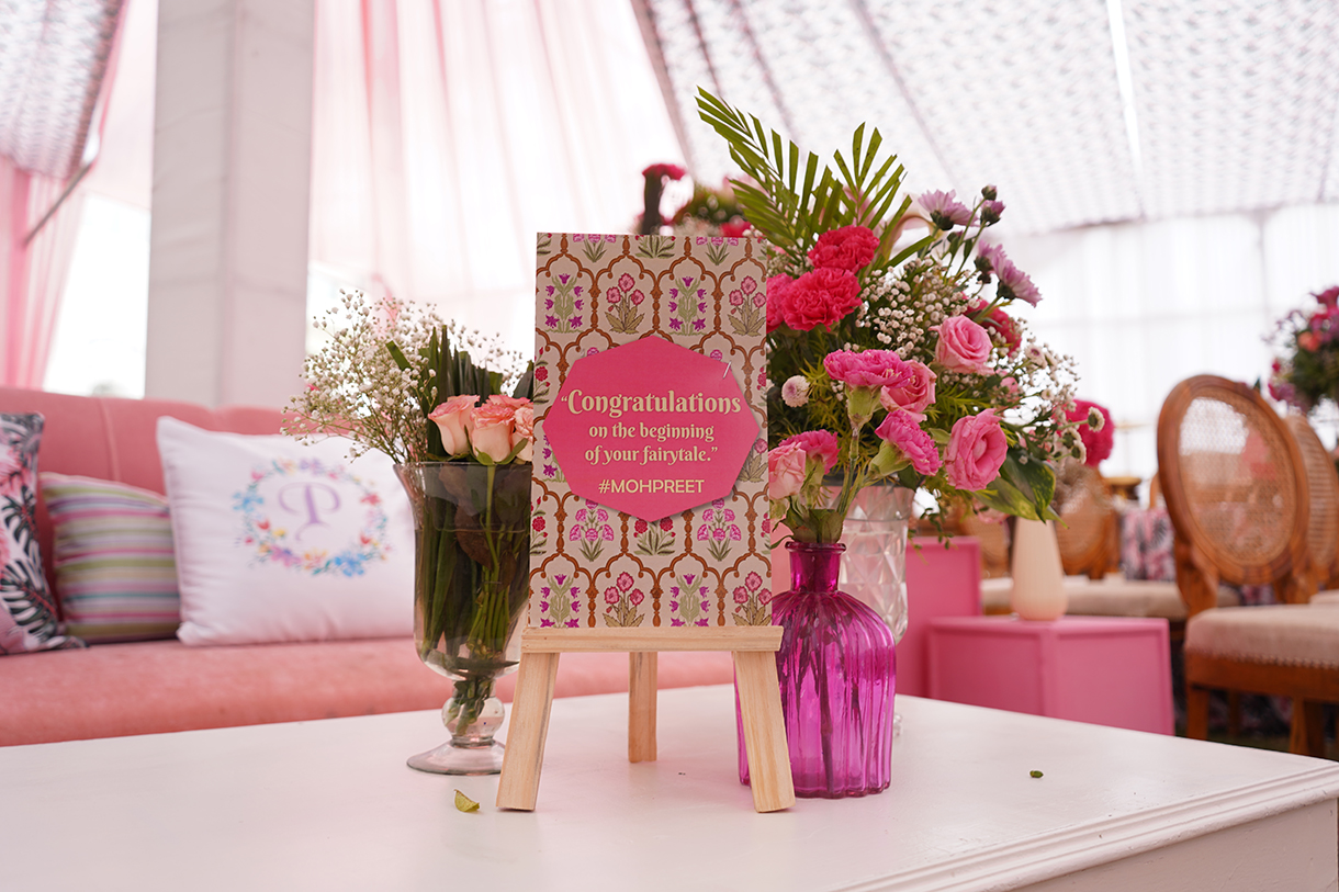 Team Bhagwati Weddings shares, “Myra’s theme was a celebration of all things pink. The decor featured an array of pink shades, from soft blush to vibrant fuchsia, creating a joyful and feminine atmosphere. Carnival-inspired food and dessert carts adorned with colourful balloons and banners were strategically placed throughout the venue. These carts offered a delightful array of treats, from cotton candy, and popcorn to mini sliders and exotic drinks. Custom-designed carts carried wedding favours and gifts for the guests. Each cart was beautifully decorated and stationed near the exit, allowing guests to choose their mementoes on their way out.