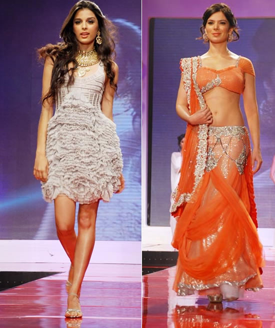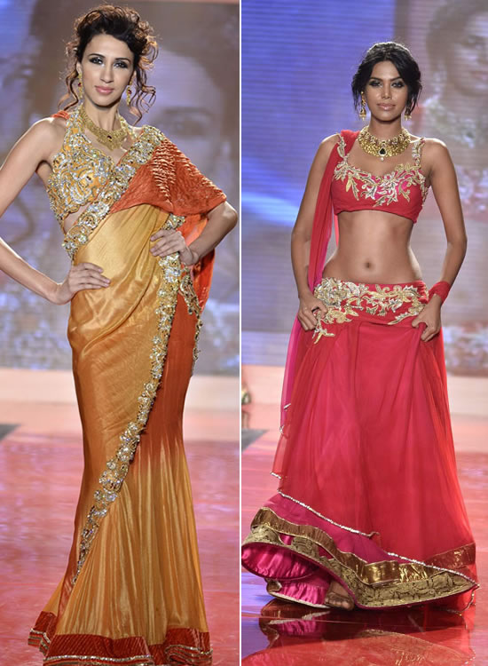 Bollywood actresses walked the ramp at Gems Vision 2012, hosted by Swarovski Gems, wearing designer clothes and showcasing Swarovski jewellery. Hard to focus on the jewellery when the clothes are so distracting. Giselle Monteiro walked in a dress by Deepti Pruthi, Celina wore a Swapnil Shinde dress, Urvashi, Tanisha & Shriya walked in Archana Kochhar creations.