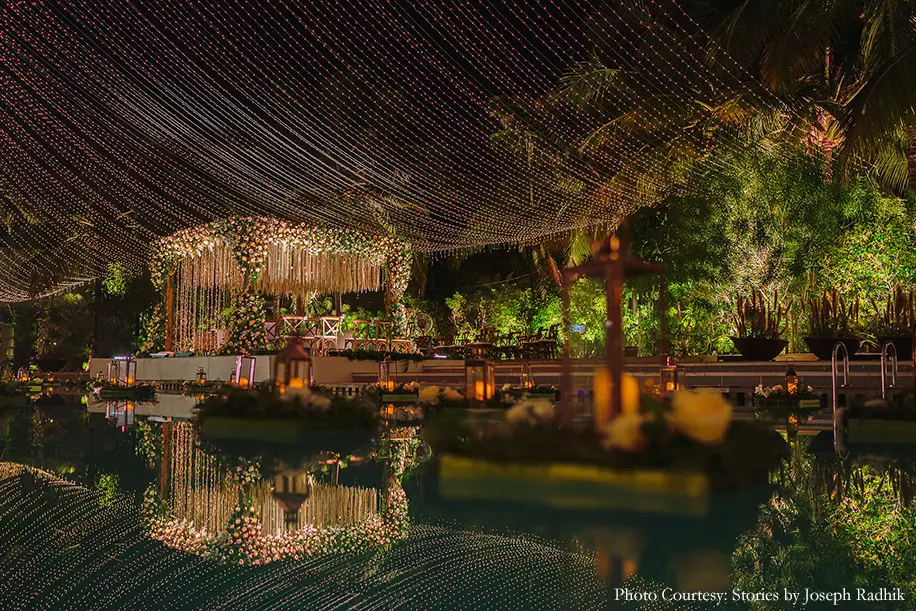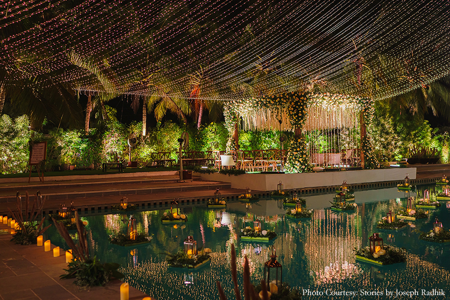 After this event, cocktails at the West Coast Terrace and dinner at the Lakeside Lounge was served. Exuding laid-back Goan vibes with hundreds of hurricane candles lighting up the venue, this event encouraged everyone to kick back and take in the sights. For the dinner, elegance was at its peak with blue and white orchids that were softly lit up by standing crystal chandeliers.