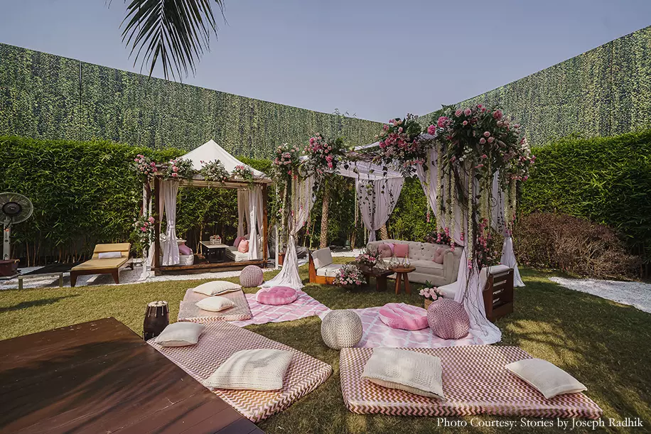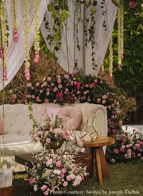 For the big day, no stone was left unturned as the decor team combined stylish old-world elegance with contemporary elements. Emanating romantic and ethereal vibes, the wedding venue welcomed the baraatis with a floral bower festooned with a plush chandelier. Crafted out of wood and adorned with delicate pampas grass, garlands of rajnigandha, and aromatic sprigs of ivy, eucalyptus, and springneri, the mandap by the pool deck was a breathtaking sight to behold. Lit up by candles, the aisle led the bride to her groom waiting at the Varmala spot which was replete with gypsophila flowers, a symbol of everlasting love and innocence. Sheltered by a canopy of fairy lights that twinkled merrily under the velvety night sky the wedding emanated divinity. And after the couple had tied the knot a scrumptious dinner was served under the stars at the poolside garden.