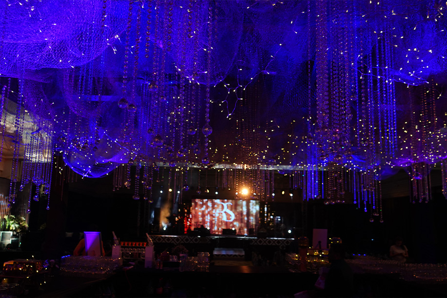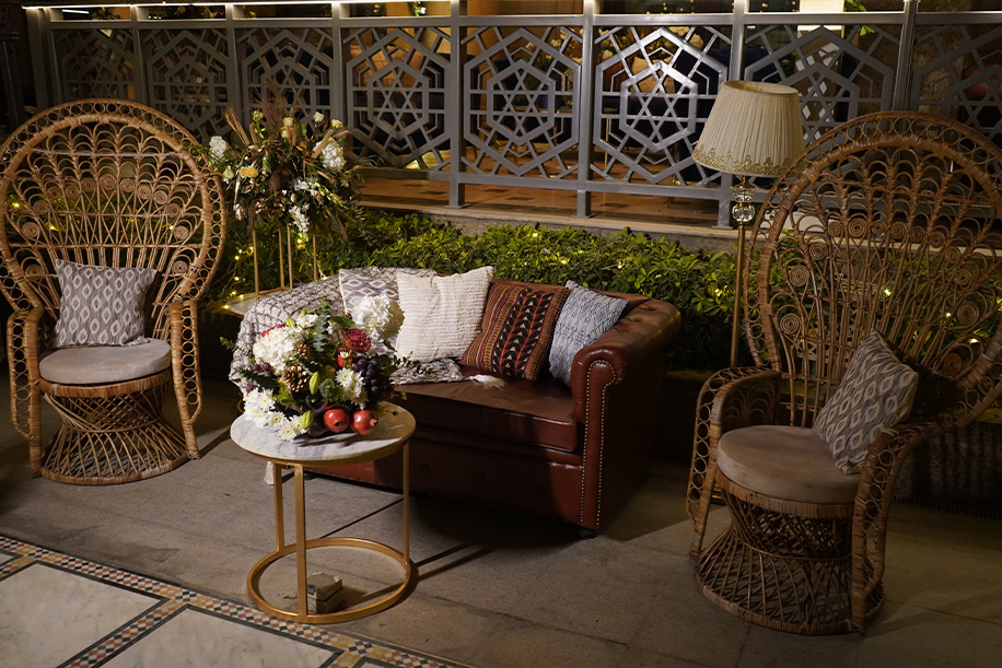 “The biggest challenge with this wedding was the hotel capacity. For the welcome dinner, we had over 250 people while the venue space could hold only up to 175. To overcome this, we extended the venue to not just the given space but also the restaurant and its alfresco segment. We created 3 sets of the bar and planned the layout to ensure nothing was restricting the movement of the guests. We replicated a similar setup for the ballroom mehndi to create pockets of experience.”