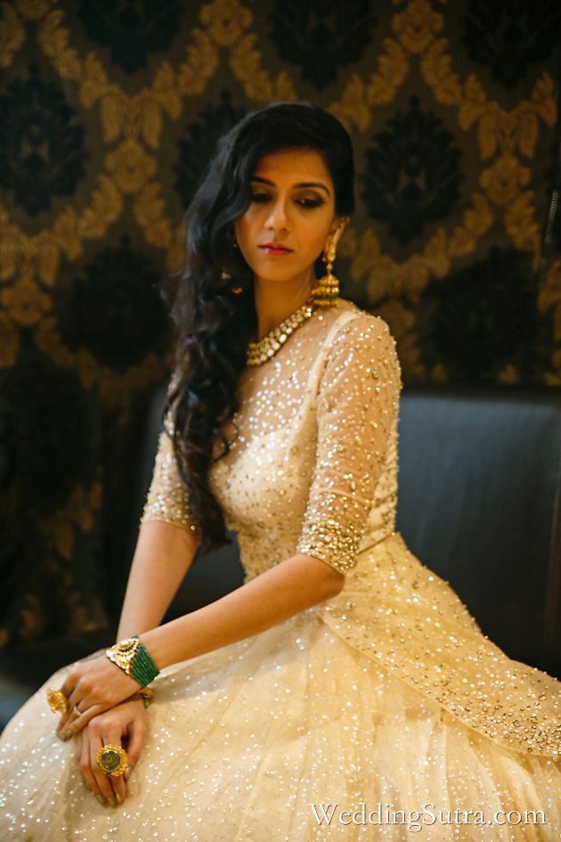 To compliment the stylish outfit, Makeup Artist Kumar Iyer first used a full coverage oil free Matte foundation by Bobbi Brown to even out her skin. He then swept her cheeks with a MAC Style blush. Next, he used a Laura Mercier lip plumper on her lips, topped it with a peach gold gloss by Lancome, and then filled her lips using a Bobbi Brown Petal lip pencil. For her eyes, Kumar used the MAC mineralise high shine eyeshadow for a soft smokey look. He then used the Lakme Absolute Kohl and Hypnose Drama Mascara by Lancome, after curling her lashes with a Shu Uemura lash curler. With her makeup done, Kumar then created waves with Nishka’s straight hair, pinning it away from the face for a soft bridal look.