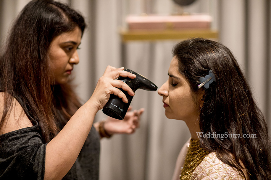 Makeup Artist Shaili Shah using her airbrush techniques to achieve a flawless look for bride-to-be Dhara.
