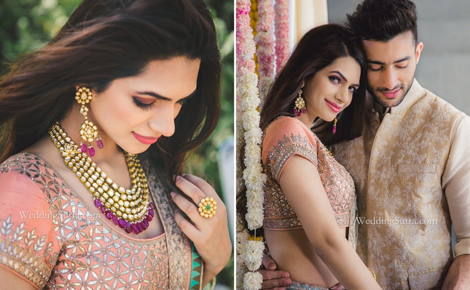 The bride was resplendent in a beige and maroon lehenga by Shyamal and Bhumika as she walked hand in hand with the groom dressed in an understated maroon sherwani also by Shyamal and Bhumika. The bride chose a polki set by Velvetcase studded with red and green enamel perfect for an intimate celebration.