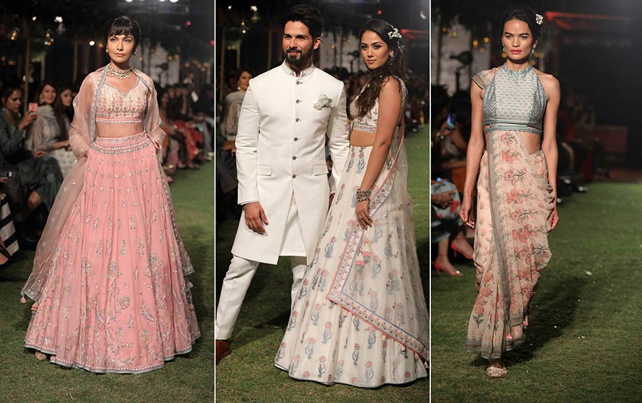 The designer duo’s “Wonderland”, a luxury Prét bridal collection, was an interpretation of an enchanted wedding ceremony. Lush hand-woven silks, satin, and tulle in serene pastels like pink, grey, violet and blue, were embellished with beads, crystals, and pearls. The collection with its glorious aesthetics held a dream-like quality fit for nuptials that are straight out of a fairytale.