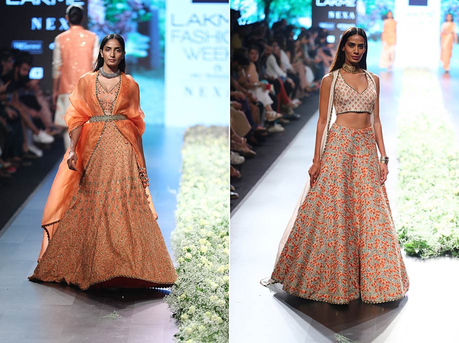 Lakmé Fashion WeekBridal ensembles in oranges and peaches by SVA by Sonam and Paras Modi