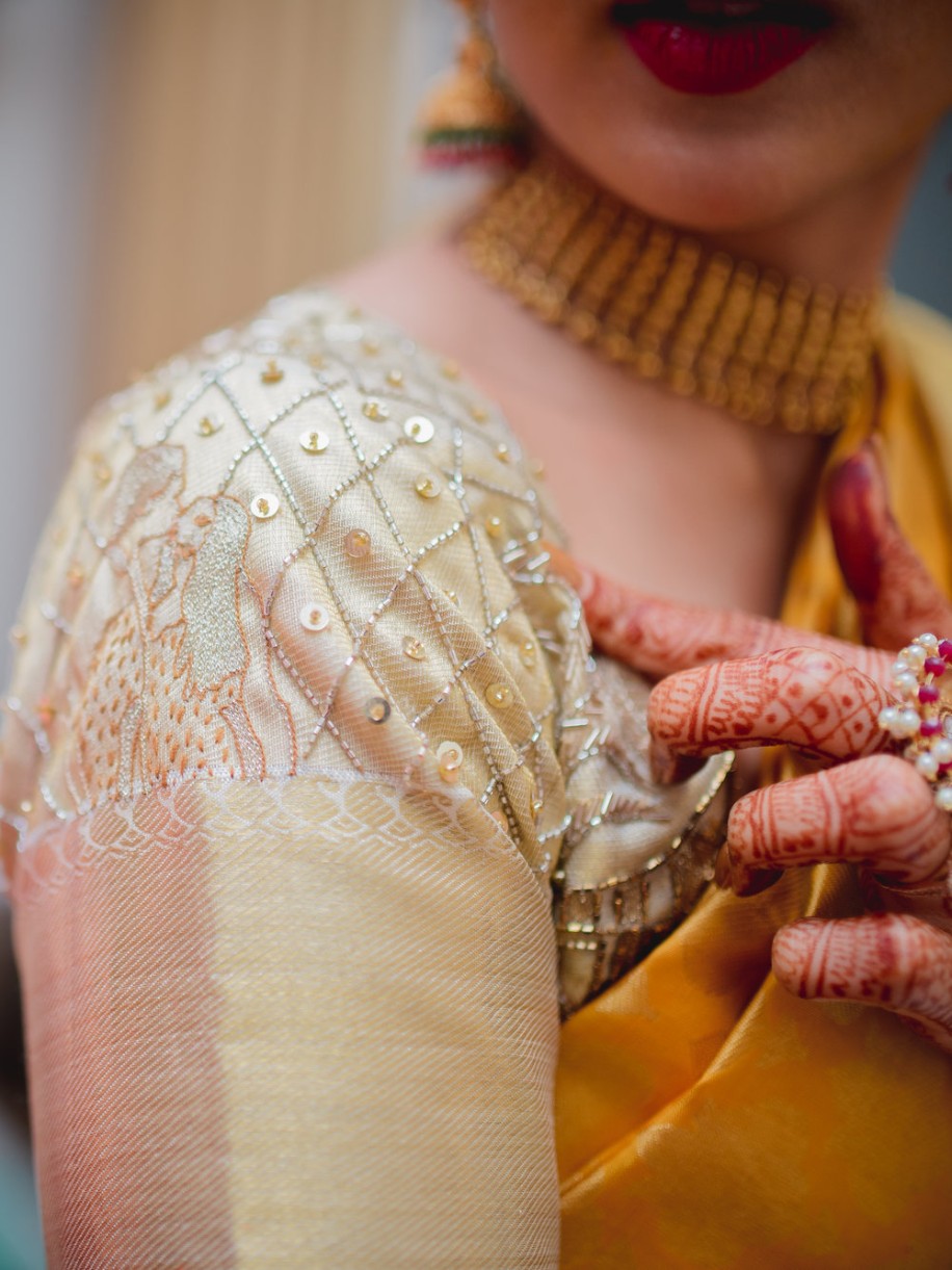 On her wedding day, a vision in a white and gold Kanjivaram saree, Namrata’s bespoke blouse was the star of the show. An integral part of the wedding prep, Namrata’s heart was all in what will become a keepsake, “Perhaps the only thing I was equal parts nervous and excited about throughout the planning was this blouse. But like a majority of things, I had an insane time drawing, writing, tracing, designing and goofing around with some of my favorite people!”