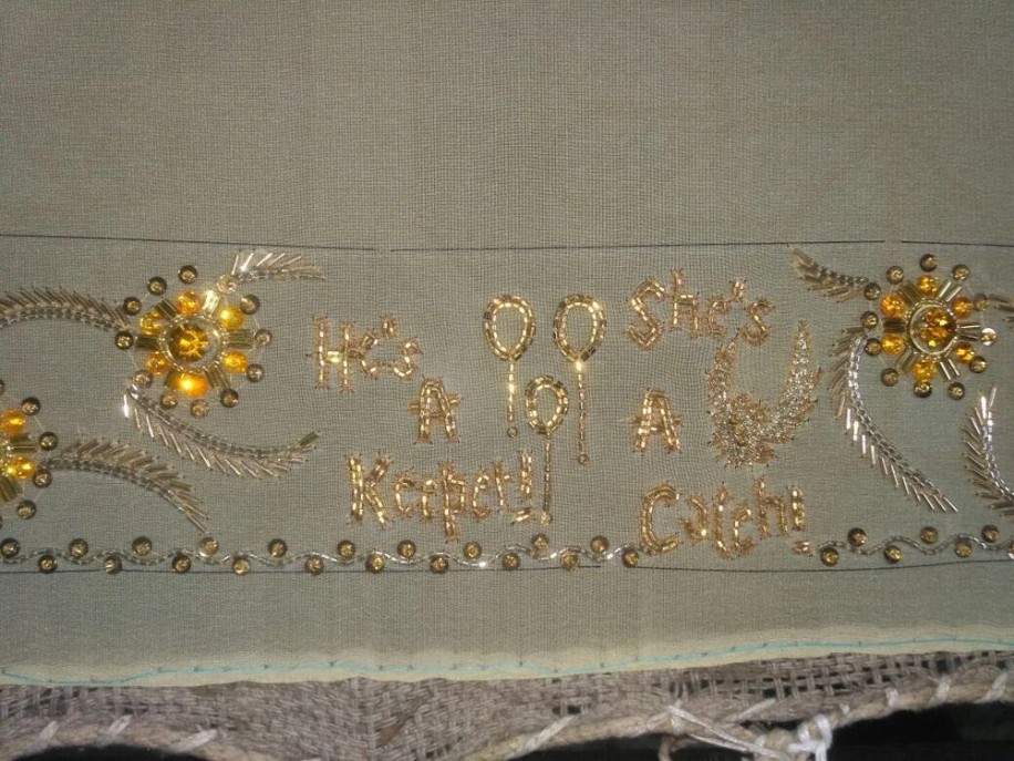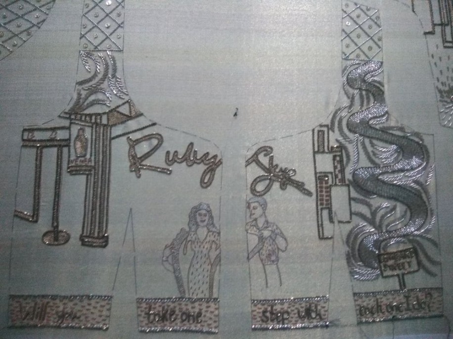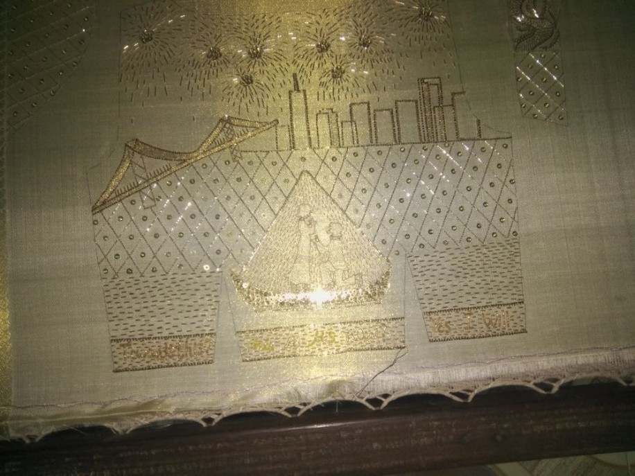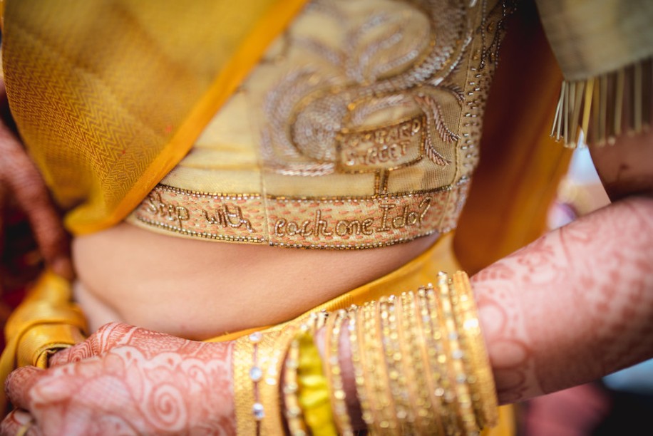 This enterprising bride deconstructs the design of the garment to explain her vision. It began with the fabric, “I used the blouse that came with the white-and-gold Kanjivaram sari but to add a contemporary touch we put 1-inch Salli fringes on the sleeve border.” Then it was time to infuse her story into it, “The front of the blouse featured a snapshot from December 31, 2013, and the back, the same date, exactly 4 years later which was the proposal. The sleeves had silhouettes of two of our favorite photos and the bottom part of the blouse had a line written by my husband. The left and right side had throwbacks to the first date and first car drive on Lombard Street!”
