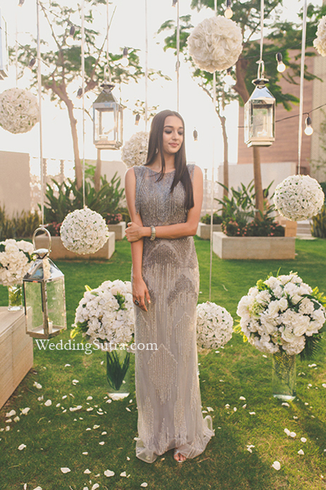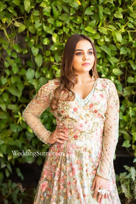 Subdued colours spell sophistication. Pair them with sparkles and you are bound to get something that looks utterly glamorous. Shagun’s beige body-fit gown by Karleo Fashion with lattice-like embroidery all over was an outfit that looked like it was borrowed from international runways. The statement neckline paired with sleek hair and minimalistic jewellery had her looking like a true diva.