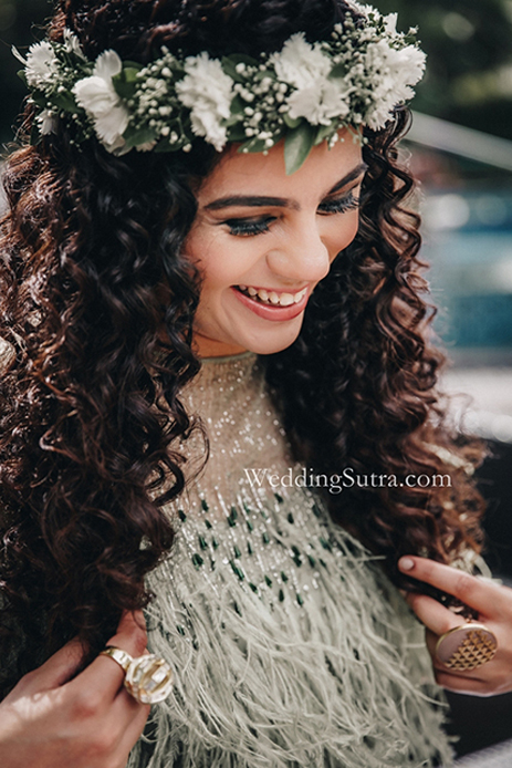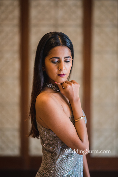 Have you ever seen a bohemian goddess? If you haven’t Mihila’s look is sure to change your answer to affirmative. The fluid fabric of her textured skirt and the dramatic bodice with sequins and feathery details were united in this breathtaking Ridhi Mehra gown. With her curly locks, warm bronzed makeup and a floral tiara she looked truly ethereal.