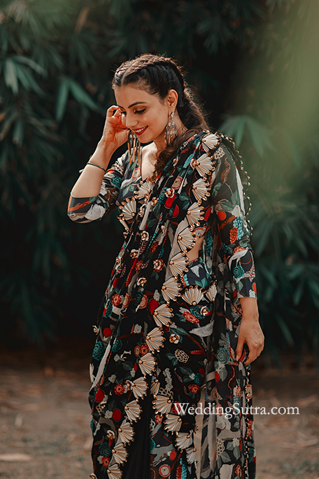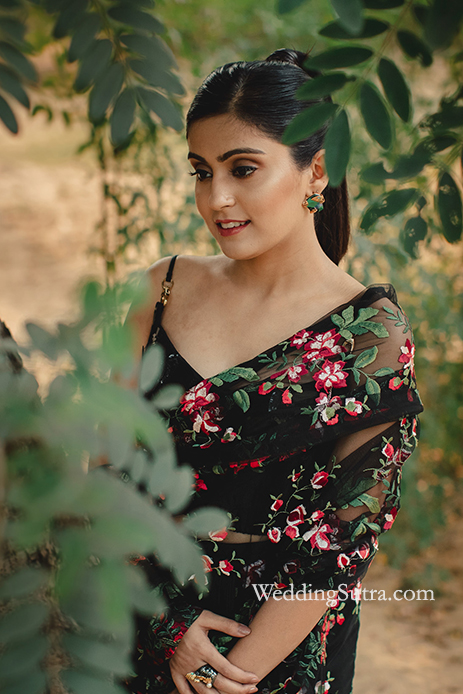 Jessica’s look takes a walk down the path that runs between bold, modern and chic all at the same time. The black net saree by Shivan & Narresh features embroidered flowers in contrasting colors of red and white and the drape is paired with a strappy sequins blouse. Complete with bold lips and a high ponytail this look was a head-turner.