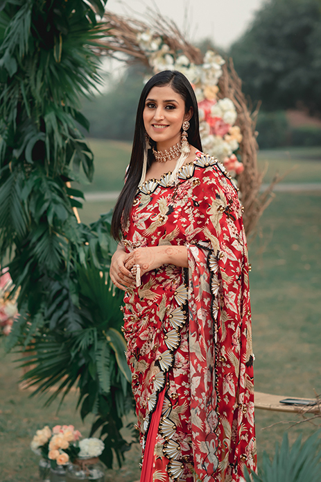 Talking about an attire that was timeless, traditional and sophisticated, Kanika’s was completely on point. Her Shivan & Narresh saree featured nature-inspired patterns and the embellished border made it fitting for the celebratory occasion. Giving a new spin to the idea of ‘The Lady in Red’ her saree was paired with a striking duster and a choker.
