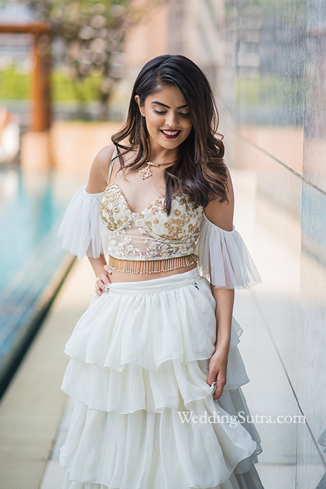 A flirty white lehenga by Label D was one that matched bridesmaid Simran’s bubbly personality perfectly. The monotone tiered skirt was paired with a ruffled cold shoulder blouse and the golden work on the top was matched with a tasselled trim. With bold lips and a few contemporary pieces of jewellery, she completed this youthful look.