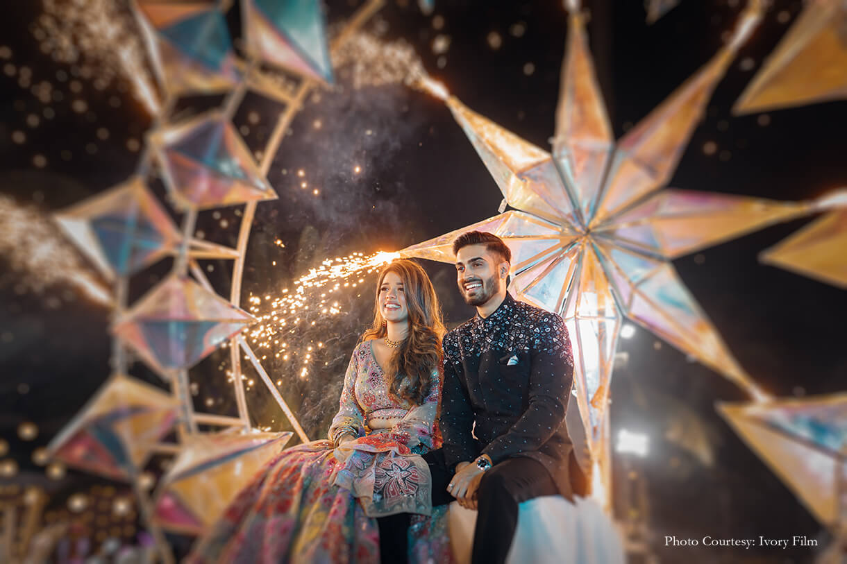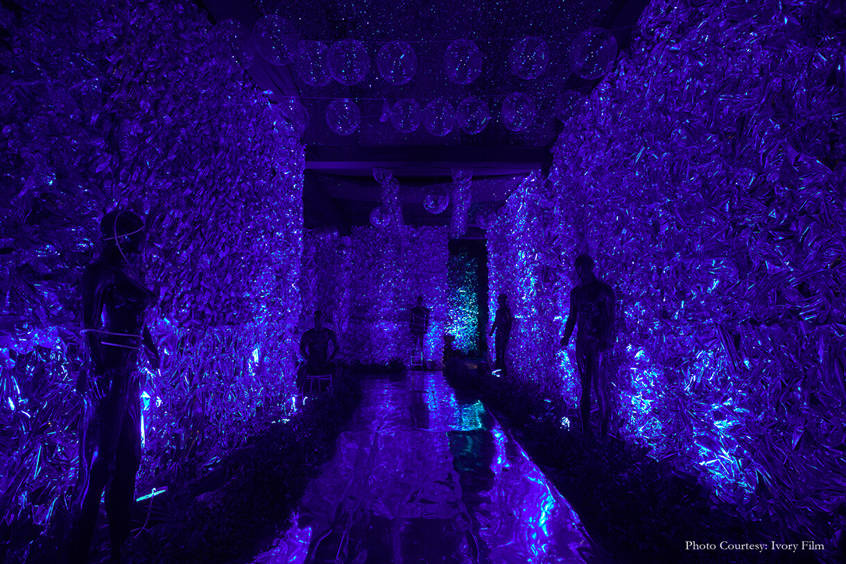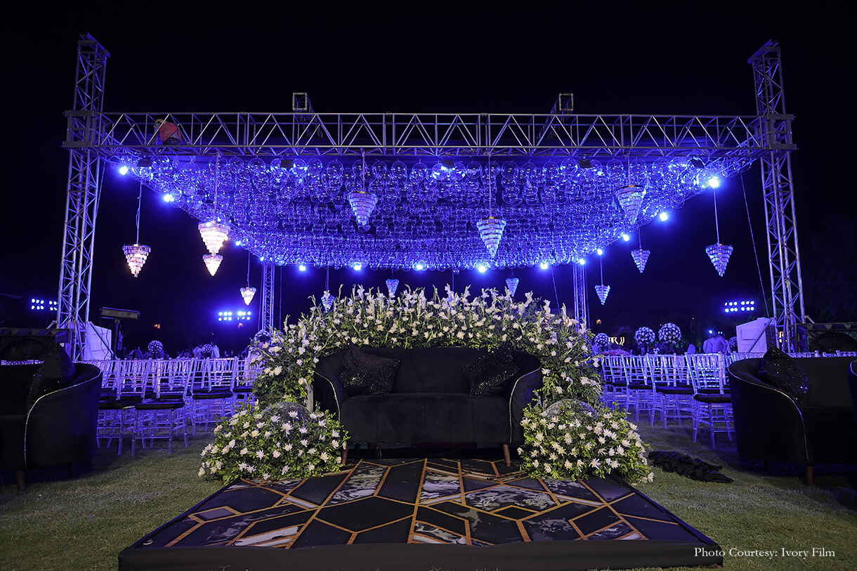 The Sangeet night came alive in a confluence of magical blue lights and glistening crystals. A shimmering metallic tunnel of starry lights, disco balls, and sleek mannequins welcomed guests into a night of enchanting decor and performances. Neon elements and unique installations added to the eclectic mood of the night. The couple and their loved ones spent the evening reveling in rousing music and dance.