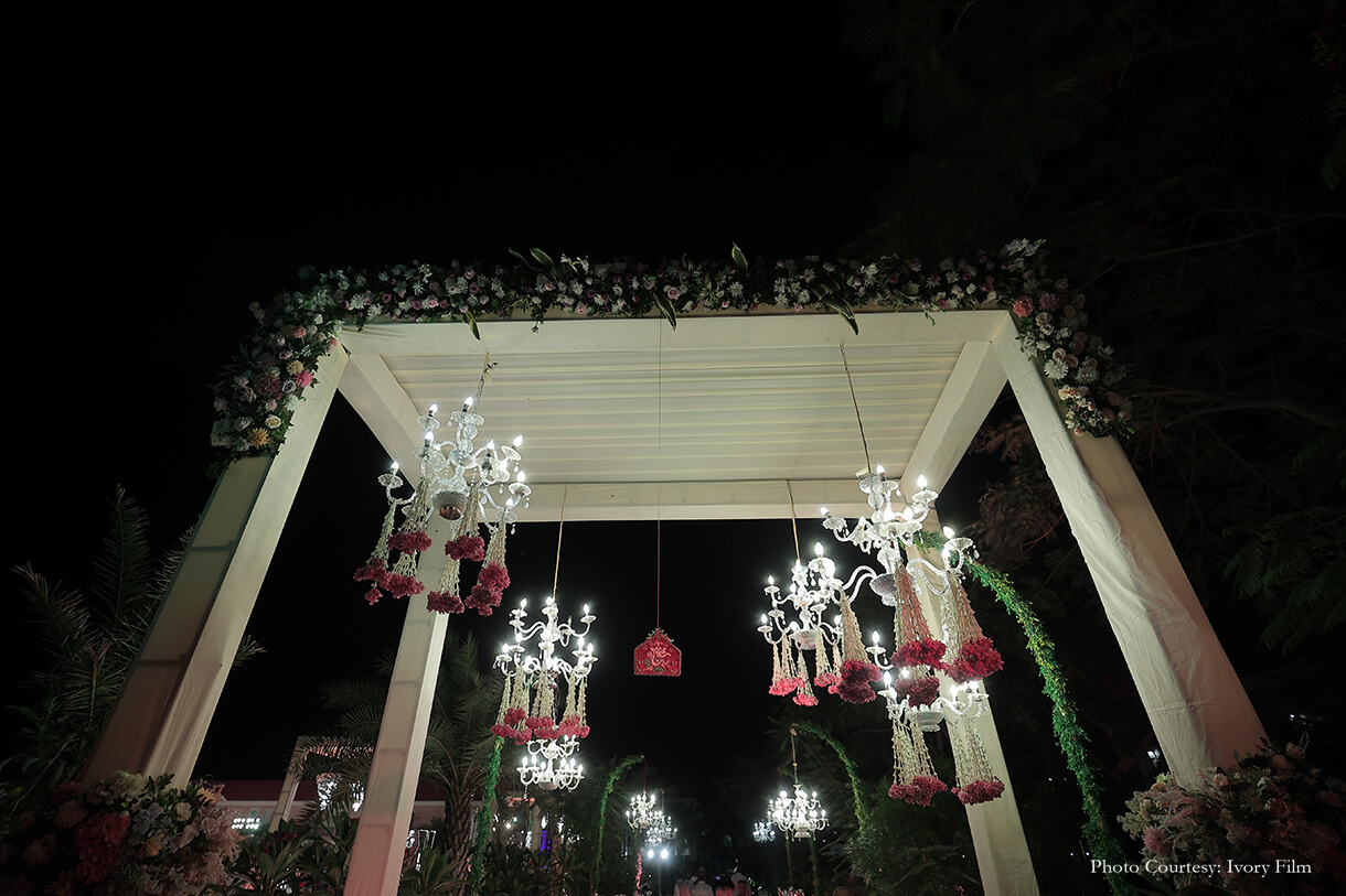 The outdoor Wedding ceremony unfolded in rich hues of red and pink, decked with tons of flowers, foliage, and glittering chandeliers. The space was furnished with various seating options for their guests, including plush sofas, round tables, and long dining tables, that elevated the setup. The highlight of the occasion, however, was undoubtedly the mandap, imagined with striking floral pillars and a canopy of foliage.