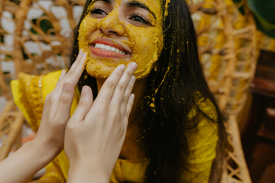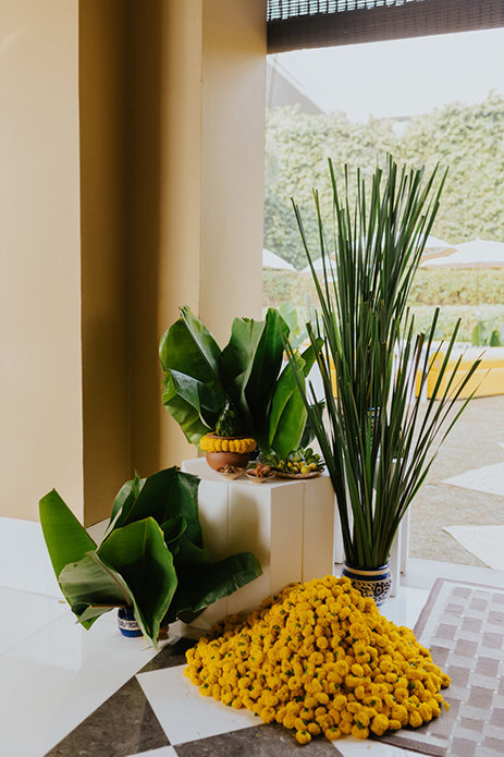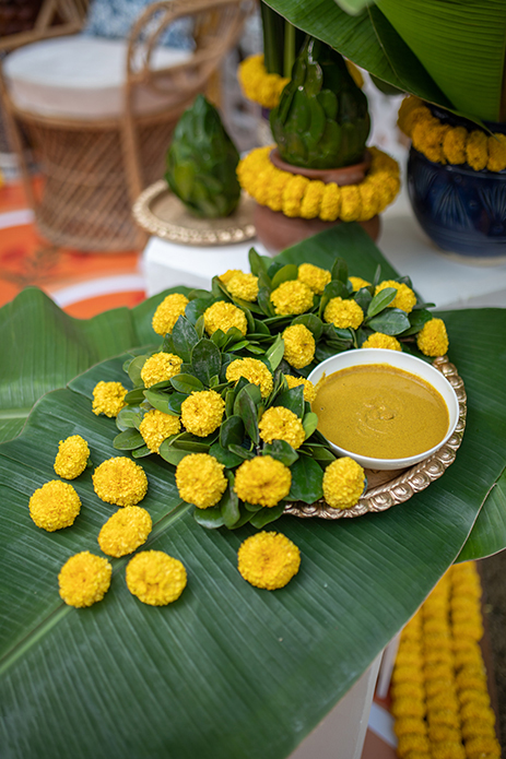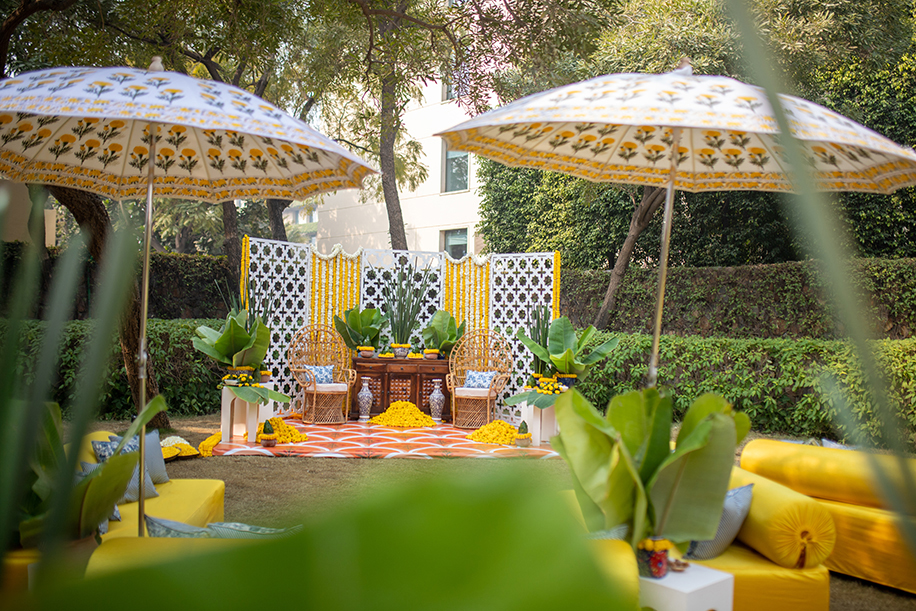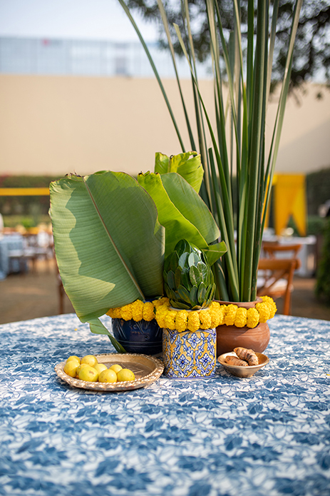 As soulful and artistic as the Sangeet was, the Haldi was a cheerful confluence of sweet memories in a colorful expression of their love story. Imagined with yellow and green centerpieces of flowers, foliage, and lemon, beautifully set linens, and an utterly unique backdrop, it was the perfect Haldi setup for Mallika and Kartik. Filled with marigolds and hints of blue pottery beautifully combined with carved wooden elements and rustic Rajasthani arts, it was a portrayal of modern ethnicity.