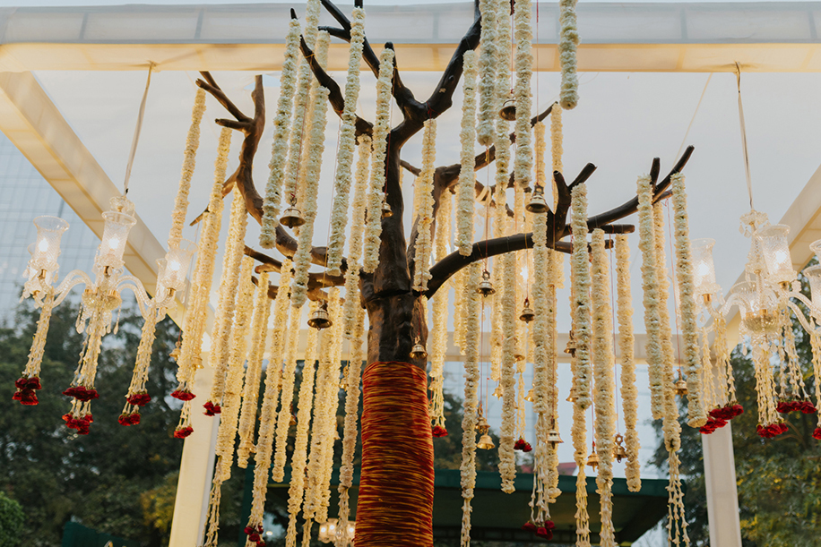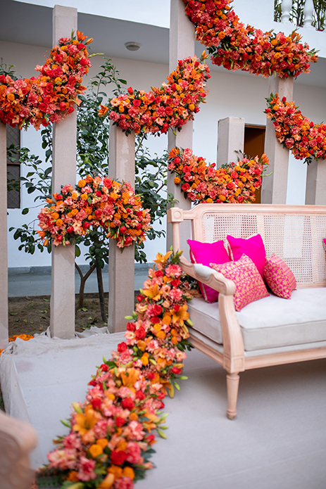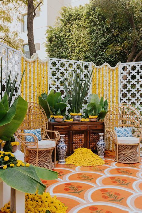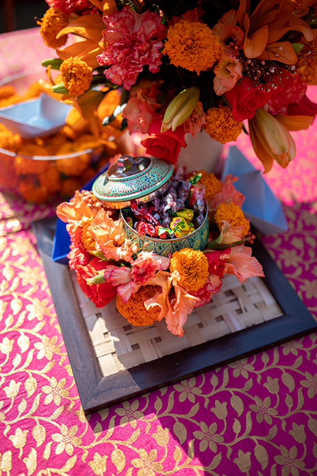 The daytime backyard Mehendi was an idea filled with playfulness, best characterized by centerpieces covered by Tiffin boxes that showcased the art of Jaipur and the sweet memories of the 90s. The orange marigolds flattered by paper boats were a perfectly unique addition to the day, complete with a beautifully designed Mehndi Favor Corner.