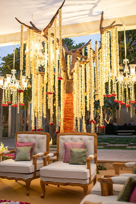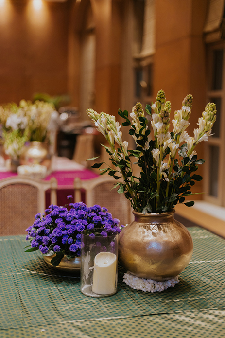 With Trident Hotel’s beautifully carved architecture, royalty was assembled in the most unique manner for the wedding in tones of emerald green and lavender with hints of gold. An abundance of traditional and exotic blooms combined with bells, antique lamps, and chandeliers set an ambiance or regal serenity. The showstopper for the evening however was the mandap, which featured a stunning tree backdrop with garlands of flowers towering over the couple as they took their vows.