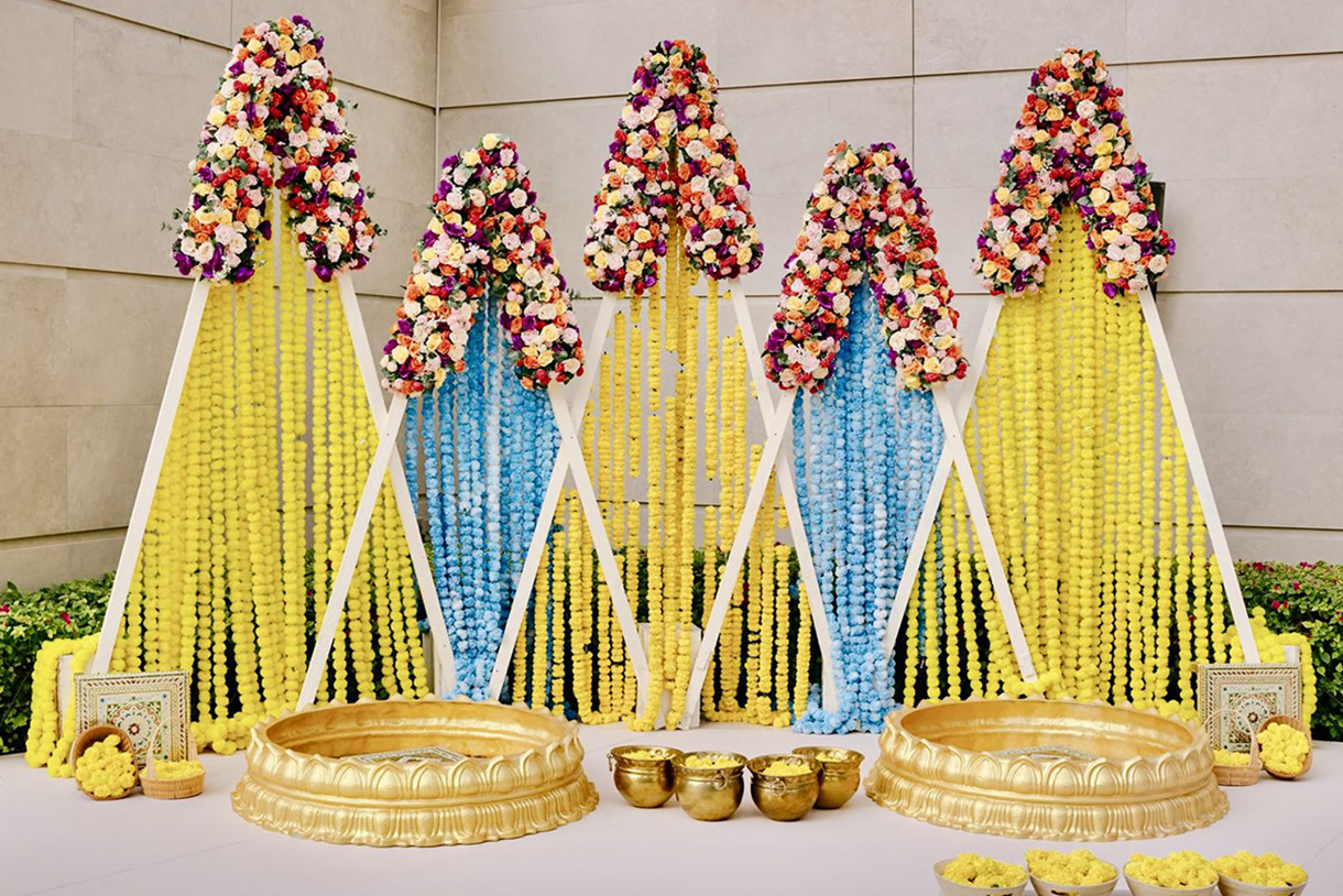 Themed ‘A Marigold Dream’, the vibrant haldi ceremony was adorned with cascading marigold garlands in every shade of yellow and orange, creating a sunny and festive atmosphere. The centrepiece of the event was a stunning floral seating area where the couple sat to be slathered with haldi and showered with flower petals.
