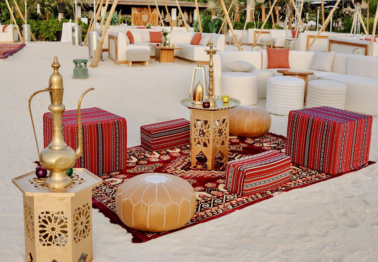 Hosted at the beachfront venue, Sunset 55 within Waldorf Astoria Dubai Palm Jumeirah the reception was themed ‘A Night of Moroccan Mystique’. Rahul gives us an overview of the decor, “Rich hues of maroon, gold, and deep purple set the tone, while plush puffy seating and ornate shisha lounges created a warm and inviting atmosphere. Table lanterns, intricate Moroccan patterns, candles, fairy lights and torches illuminated the venue. The guests were indulged to the hilt with delectable culinary creations and signature cocktails inspired by Middle Eastern flavors while a live saxophonist played soulful tunes.