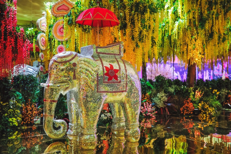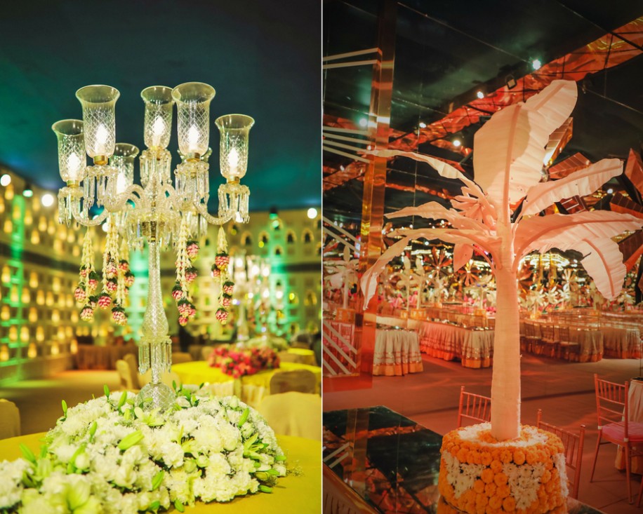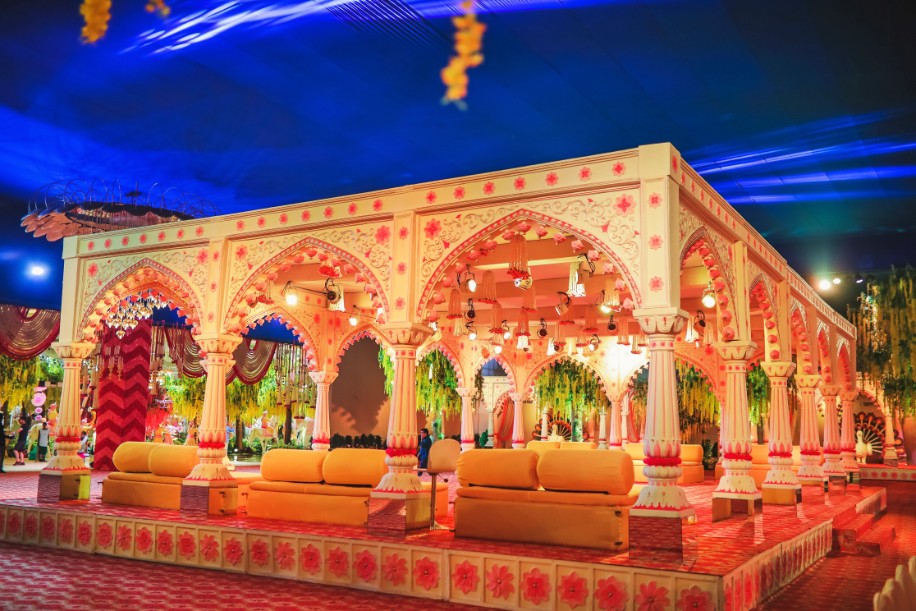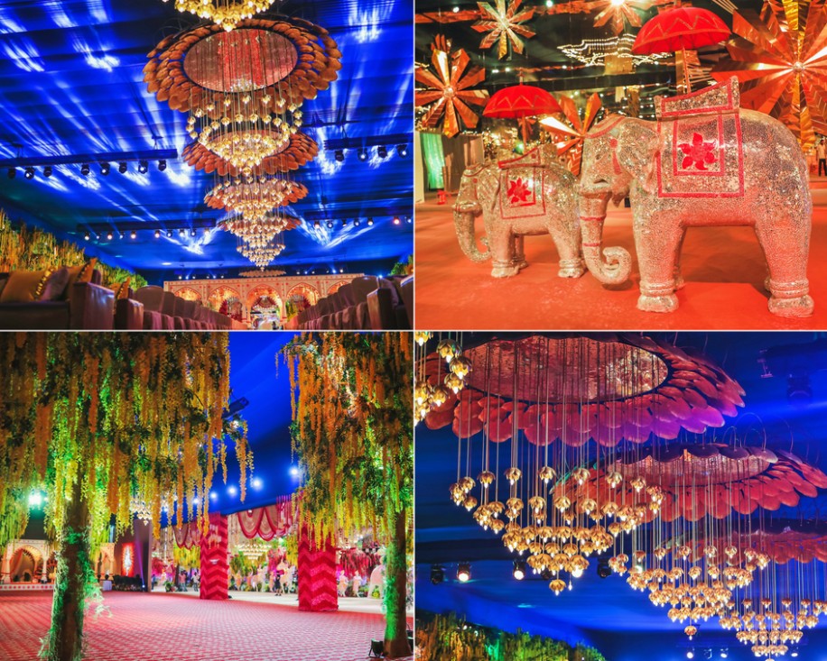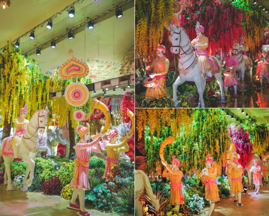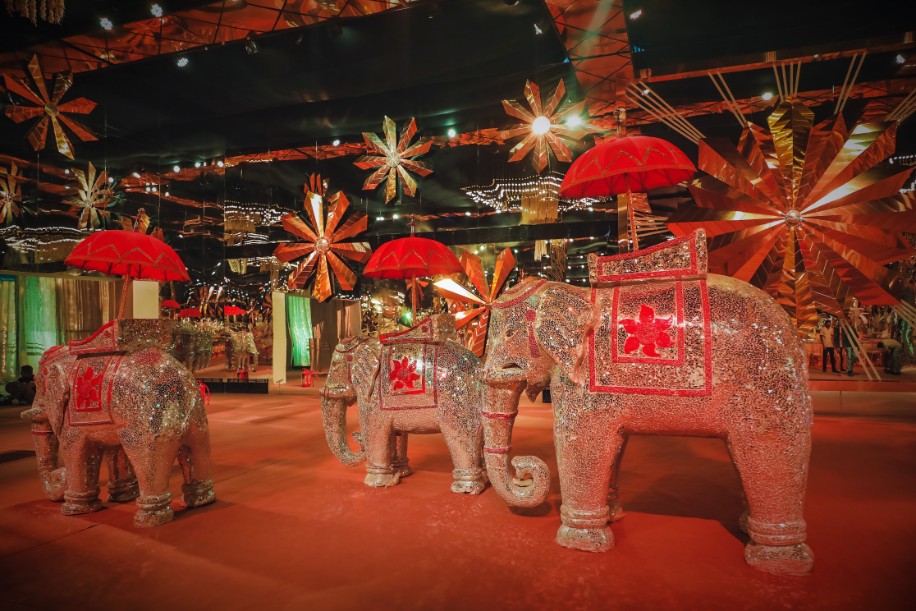The unique theme celebrated the traditions of an Indian wedding, and the attention to detail was evident in the setup. The main corridor saw figurines placed on either side to create a color-coordinated impact. The walkway displayed a ceiling covered in paintings by Jaipur artisans, and the art was reflected on its mirror-finished floors.