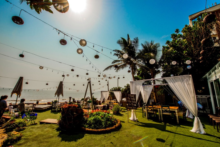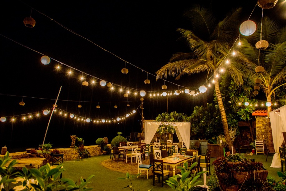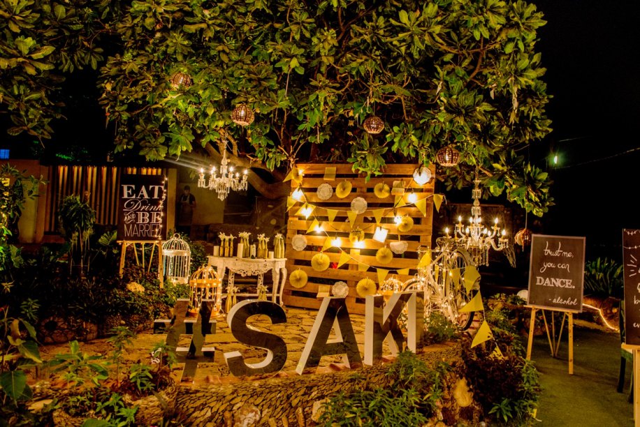 For this function, the team made innovative use of the outdoor spaces of the restaurant. Against the canvas of the vast blue sea, they created a setup using white and hints of brown. Large white tents dotted the area providing for cozy seating areas for the guests. Strings of bistro lights and white Chinese lanterns cast a warm glow on the decorations.