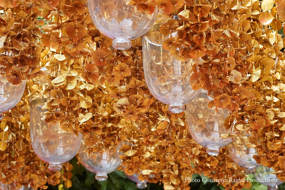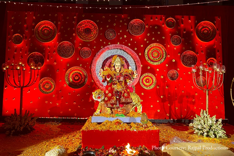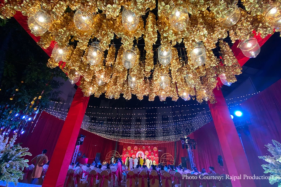 Additionally, we also added hints of gold to accentuate and balance out the rich scarlet color. Bathing everyone in its golden glow the canopy of fairy lights twinkled under the night sky while gold candle-holders adorned with white tuberoses flanked the Goddess’ idol on the stage. During the chowki everyone was immersed in spirituality as they swayed to the music!”