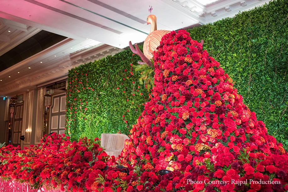 The brainchild of Anurag and the planning team, the reception was all about romance with its ‘impressive red’ decor. Anurag left no stone unturned to surprise his bride as he took charge of the event along with the team to an extent that his jacket was ordered a night before and shoes came in ten minutes before he got on the reception stage! Damini shares, “Red is Anurag’s favorite color and hence, he wanted the reception’s color palette to be dominated by red. He worked with us for days trying to figure out the perfect designs since he wanted to surprise Apeksha and finally our team went about bringing his vision to life. The decor was extremely romantic with silver vases filled with red roses and pillar candles. However, the highlight of the event was the stage on which the couple mingled with their guests. Adorned with red blooms, a lush backdrop, and a life-sized gold peacock that cascaded a garden of flowers, it was a treat for the eyes and created the perfect spot for pictures.