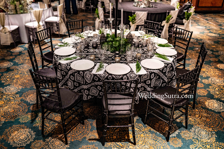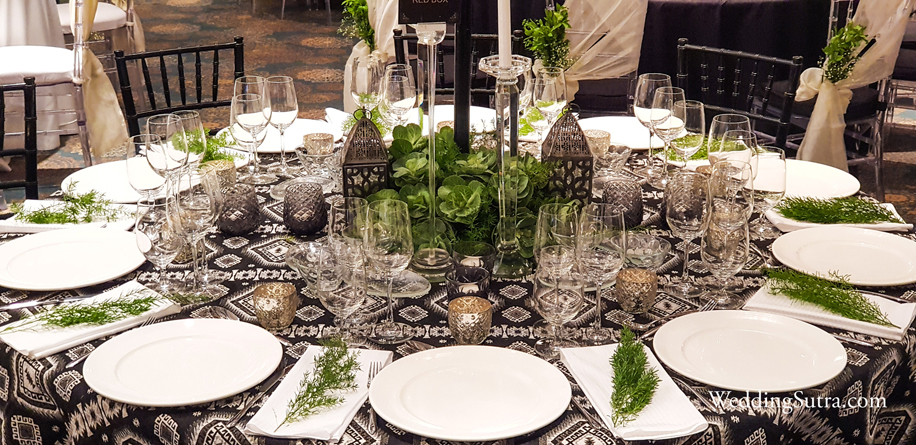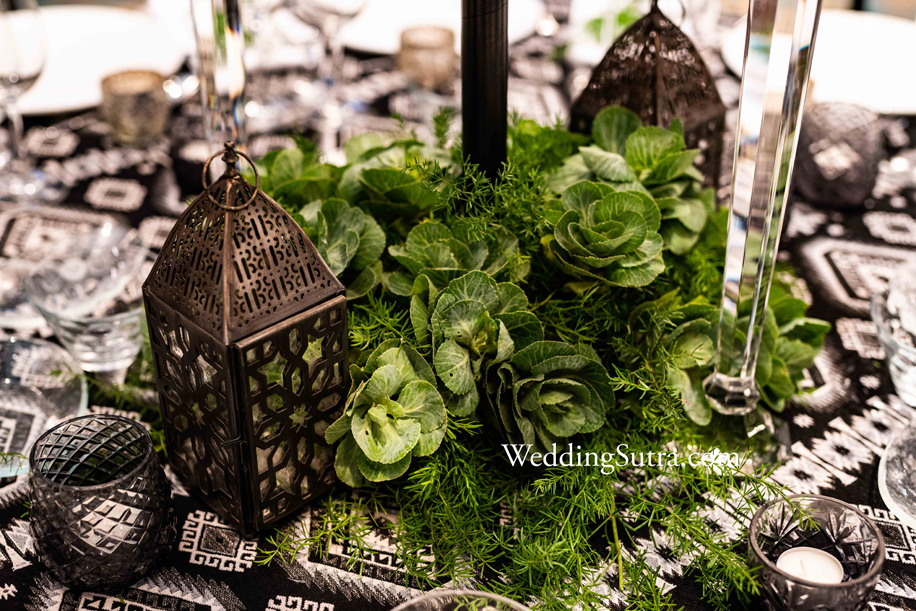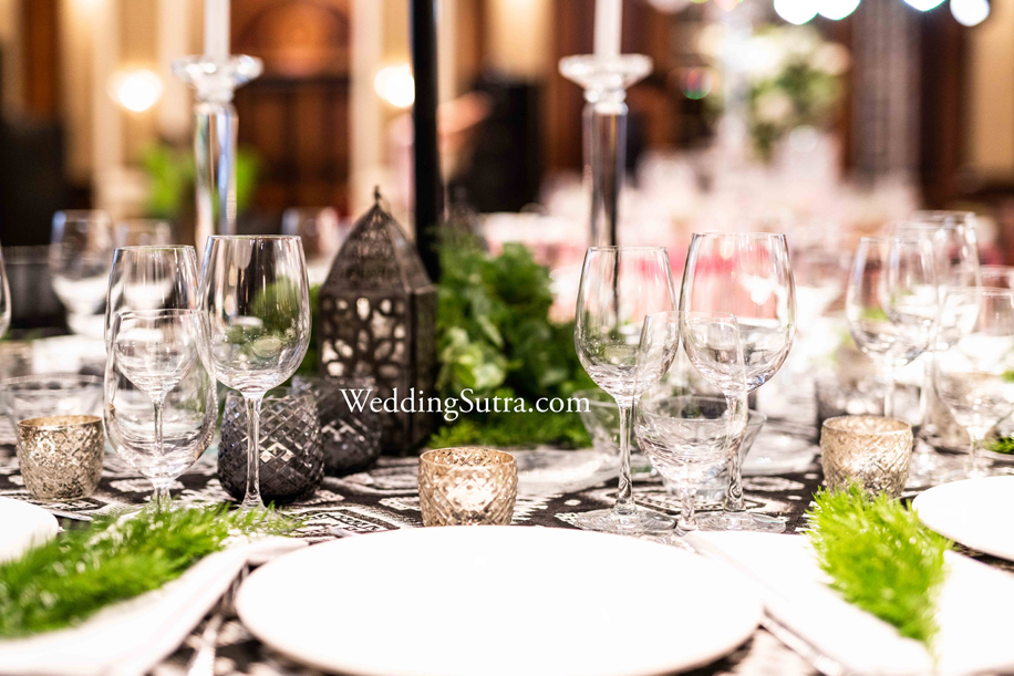 The first concept table had a sophisticated aura surrounding it as a printed black and white linen covered the table’s perimeter with carefully picked elements placed on top of it. The tea-light candles placed inside tinted glass holders, contemporary metallic lamps, classic white and silver cutlery added a hint of elegance to the table. The greens at the center of the arrangement and the fronds placed atop white napkins interlaced a refreshing vibe into the monochromatic color scheme of the table. The highlight, however, was the bunch of white calla lilies extended upside down above the table laced around a beautiful wooden framework.