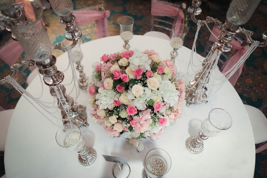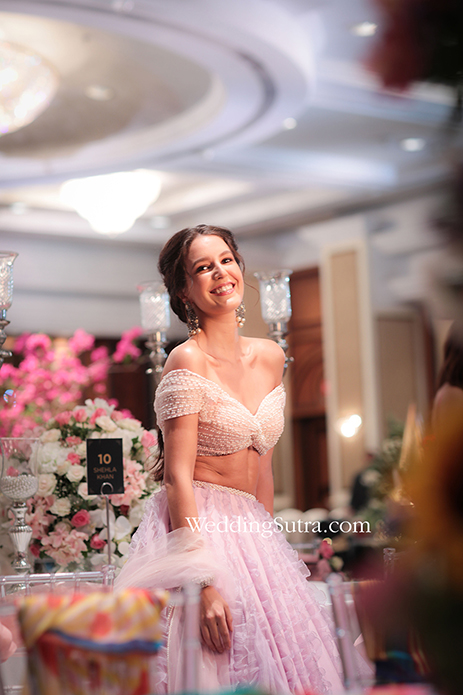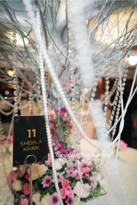The other table was just as captivating and elaborate at the same time. It had a miniature trunk with bare branches planted at the center with strings of pearls and scintillating crystals making a spectacular replacement for its leaves. The bottom of the trunk was surrounded by a bed of pink, cream and white flowers along with a generous sprinkling of gypsophila. Crystal clear glasses with pink roses completed the tabletop decor. Not just that, the designated theme-inspired cocktail for the guests at this concept table was the famous vodka-based ‘Moscow Mule’, which became an instant hit. The delicious cocktail was curated by, The Wedding Bartenders and Hops Cork. The table in its entirety felt fit for a royal fairytale wedding, after all, it was inspired by Shehla’s collection which was an ode to the most stylish and iconic real-life Princess – Diana.