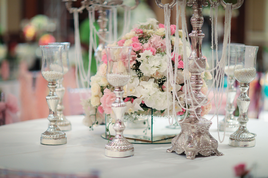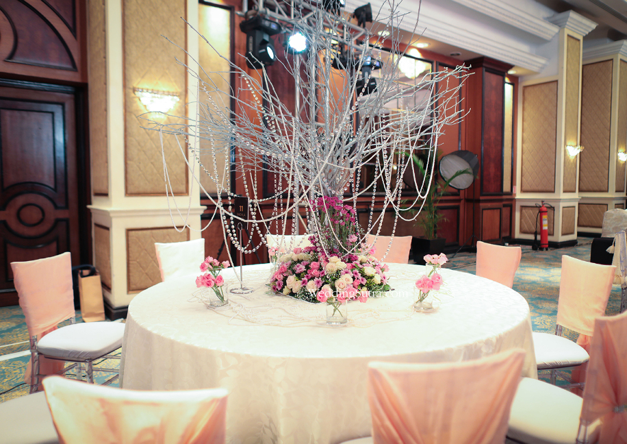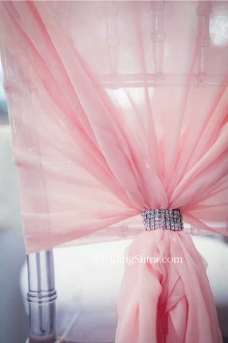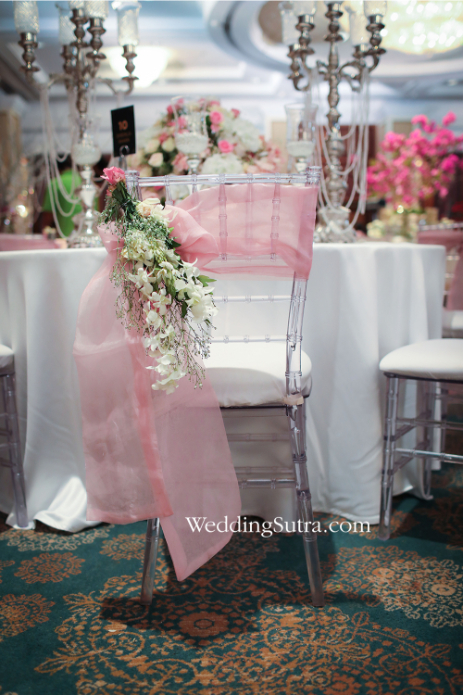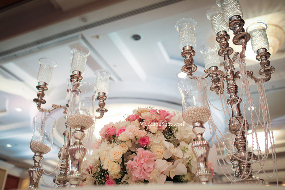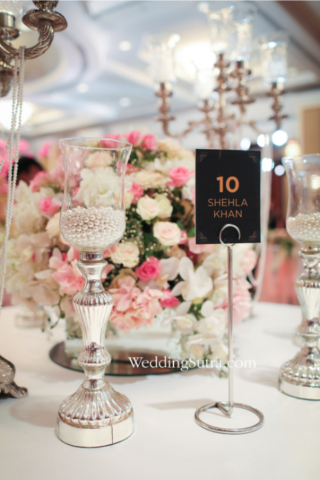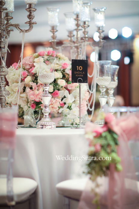 Shehla Khan’s concept tables mirrored the elegance and grandeur of the stunning outfits worn by her muses – Isabelle Kaif and Yasmin Karachiwala. One of the two tables created by the designer had a floral centerpiece with clusters of cream, pink and white flowers with inserts of baby’s breath. Surrounding it were short vintage candlesticks with glass chalices cradling lustrous pearls, while loosely hung strands of pearls strung from the metallic branches of the centerpiece. The chiavari chairs propped around this table were draped with a pale pink tissue fabric along with orchids, pink roses and gypsophilas beautifully hanging from one side of the backrest.