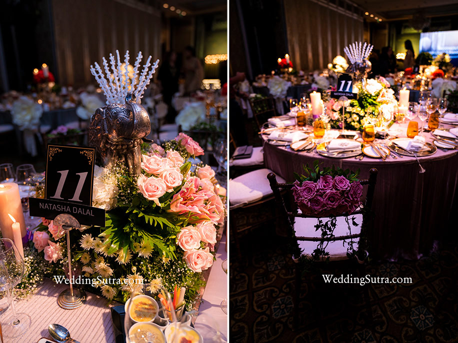 With the British Raaj, India saw an influx of ideas and influences from the West, and with time, they became a part of the Indian fabric. Natasha Dalal’s table was an ode to this fusion of designs from these two different parts of the world. Her table was graced by one of the most majestic animals found in India, the elephant. A golden sculpture of this gentle giant sat on a pedestal that was placed on top of a vibrant bed of flowers and greens. A beaded fan emerged from the setting adding a touch of grace and several candles surrounded the setup.