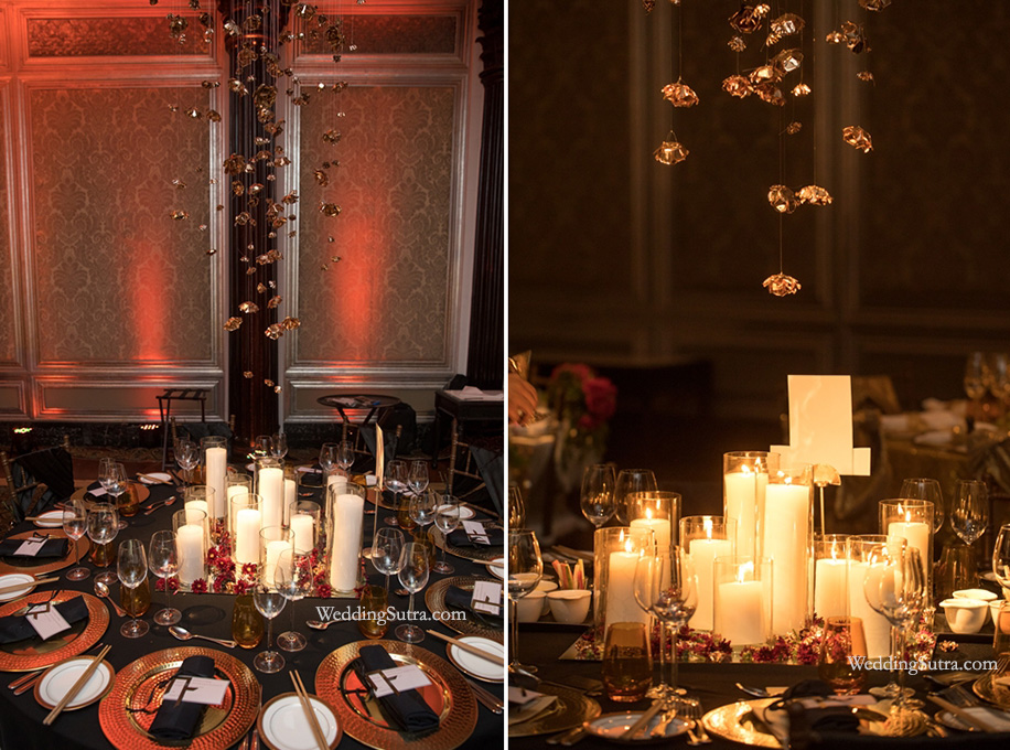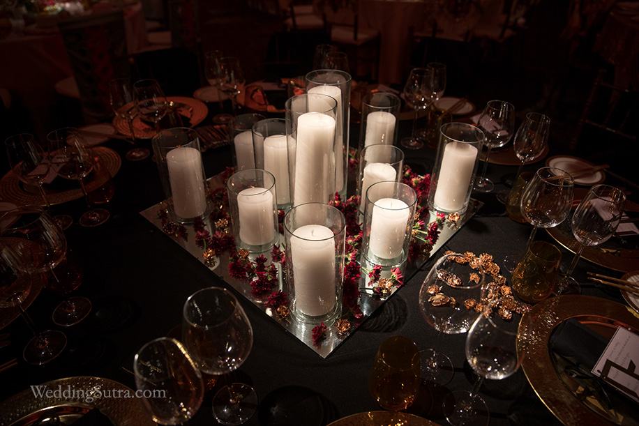 With large floral chandeliers reminiscent of a floral shower at an Indian nuptials, these tables were easily two of the most eye-catching ones at the event. The colossal installation with metal flowers cascading from the ceiling to a little above the candles inspired a sense of awe. To further the floral theme, small fresh blooms were scattered on the mirror that lay in the middle of the table covered in an all-black, full drop tablecloth.