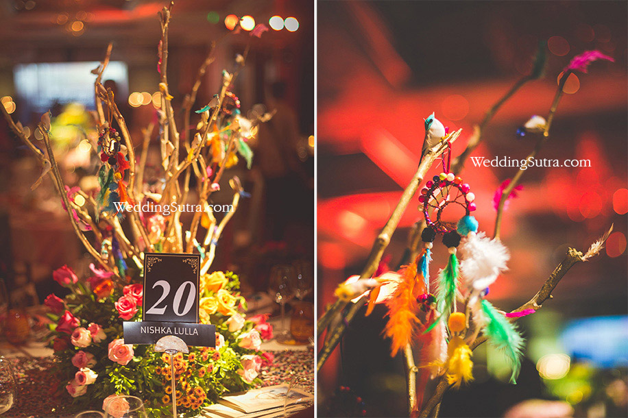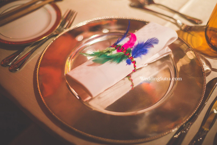 Feathers were another aspects of the setup could be seen on the dreamcatchers that the hung from the centerpiece, the edge of the glass candleholders as well as the napkin ties. In the middle of the table, a sequenced table runner sat adding a touch of glam to the muted table overlay.