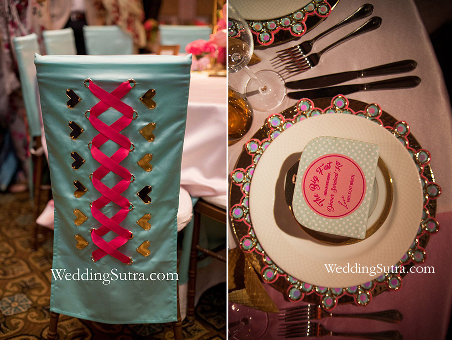 For her colorful table, the designer made use of metal rivets to up the glam quotient. She created satin fabric slip-on backs for her chairs that were embellished with gold rivets and shocking pink ribbon that ran through them. To further the theme and add to the kitschy appeal of the setup, a decorative ring of golden rivets piercing through mint green and candyfloss pink fabric was placed on the under plates.