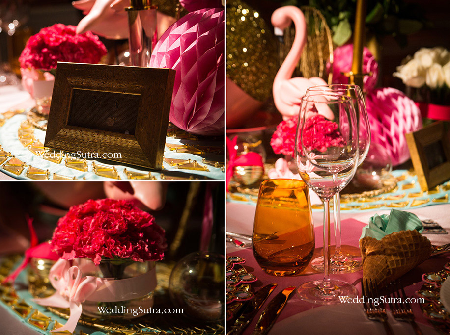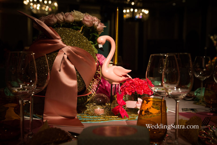 In the middle, a few elegant, as well as idiosyncratic features, were arranged to exude a cool chic vibe. Bunches of roses and carnation in shades of pink were placed alongside a large glittery globe which shaped to look like a bomb and was tied with a pink ribbon. A graceful flamingo, candles in mint green and pink were other additions to the central setup placed on a layered overlay.
