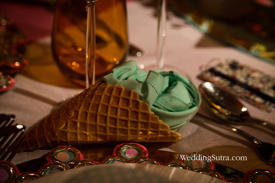 While every detail on the table was one-of-a-kind, the two elements that truly stood out were the napkins in waffle cones designed to like an ice cream and the ‘wedding survival kits’ designed by the designer as favors for her guests.