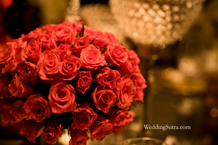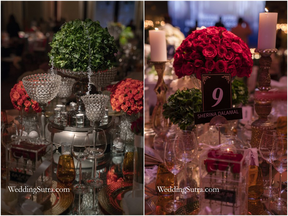 A large mirror of the size of the table which was placed on top of the muted overlay made for a reflective canvas over which she painted a picture of modern elegance. In the center of the table top, a large arrangement of lush green was placed in a crystal stand that stood atop a mirrored tray. Bunches of deep red roses encircled this element while glass candle holders dispersed a warm glow over the setup. At every seat, the designer placed a personalized box of fresh blooms next to the crisp napkins which were folded with one white rose each.