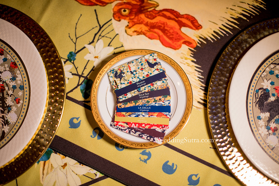 Praslin influenced the design of the overlays on the duo’s second table. A feast to the eyes, the subtle finesse of a nuanced Praslin print introduced a neutral zone of chromatic indulgence. While they maintained a synergy across both setups, subtle differences could be noticed in the underplates and table napkins.