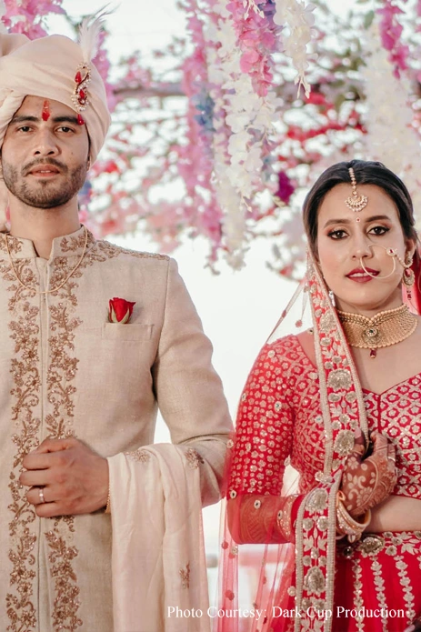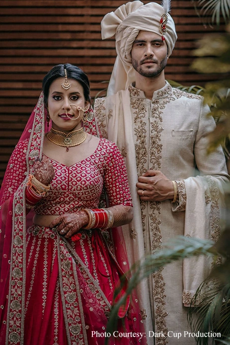 If you’re aiming for a look that exudes regal vibes without going overboard, then take a cue from bride Aditi. Making a resounding statement with an intricate gold choker necklace set with delicate filigree work and a gem-encrusted design in the center, her wedding jewellery from Tanishq perfectly complements her elaborate lehenga. Finishing her look with a traditional flair is a large nath, a chaandbali style maang tikka and signature, bright red bridal chooda.